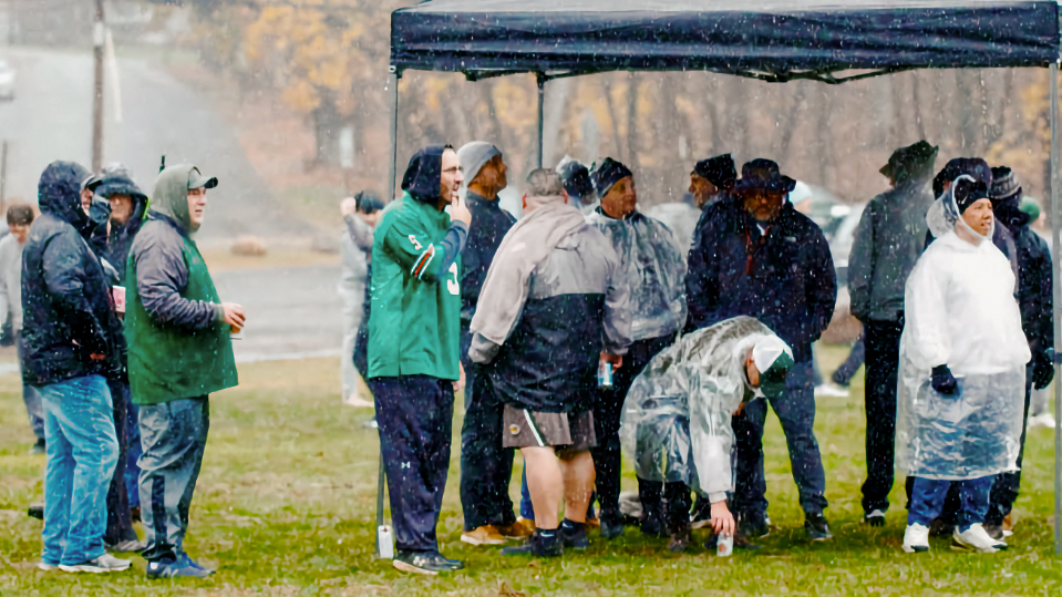 The Turkey Bowl gives fathers and sons a chance to bond on the field while neighbors connect off the field, cheering and laughing despite the less-than-ideal weather.