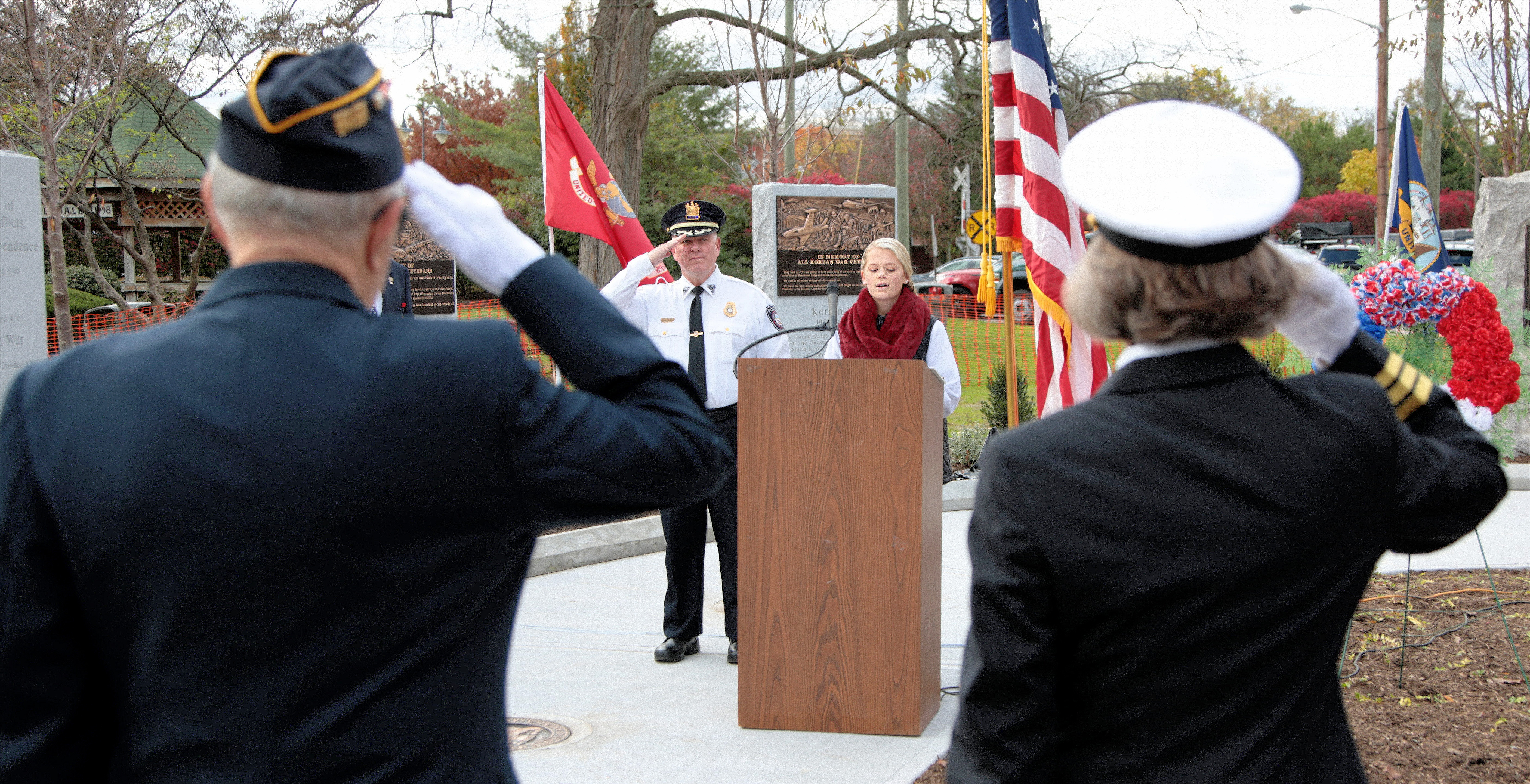 The ceremony further recognized each branch of the United States armed forces, the speakers taking the time, before and after their remarks, to salute where their service markers stand for a major historical conflagration paid in American blood and treasure.