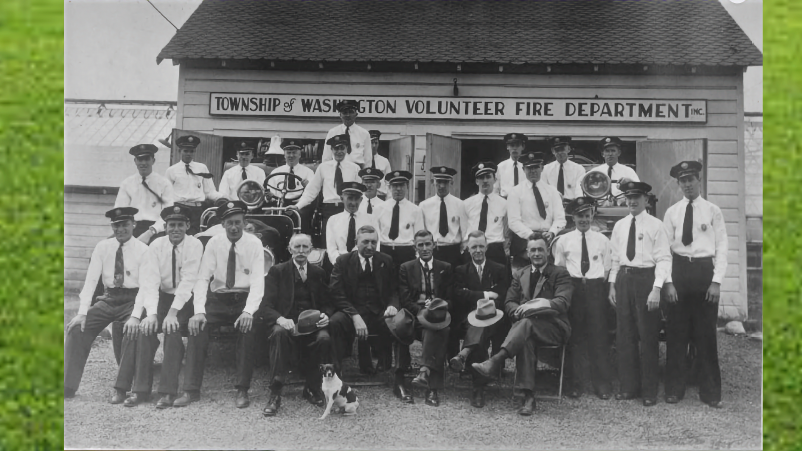 Eventually Ruddell’s group disbanded and in 1938 the Township of Washington Fire Department became the official firefighting entity, with the township budgeting $500 a year for equipment. The department members, along with a cute little mascot, can be seen in the photograph above, taken that same year. They are in front of the original firehouse, which was on Washington Avenue across the street from the present one.
