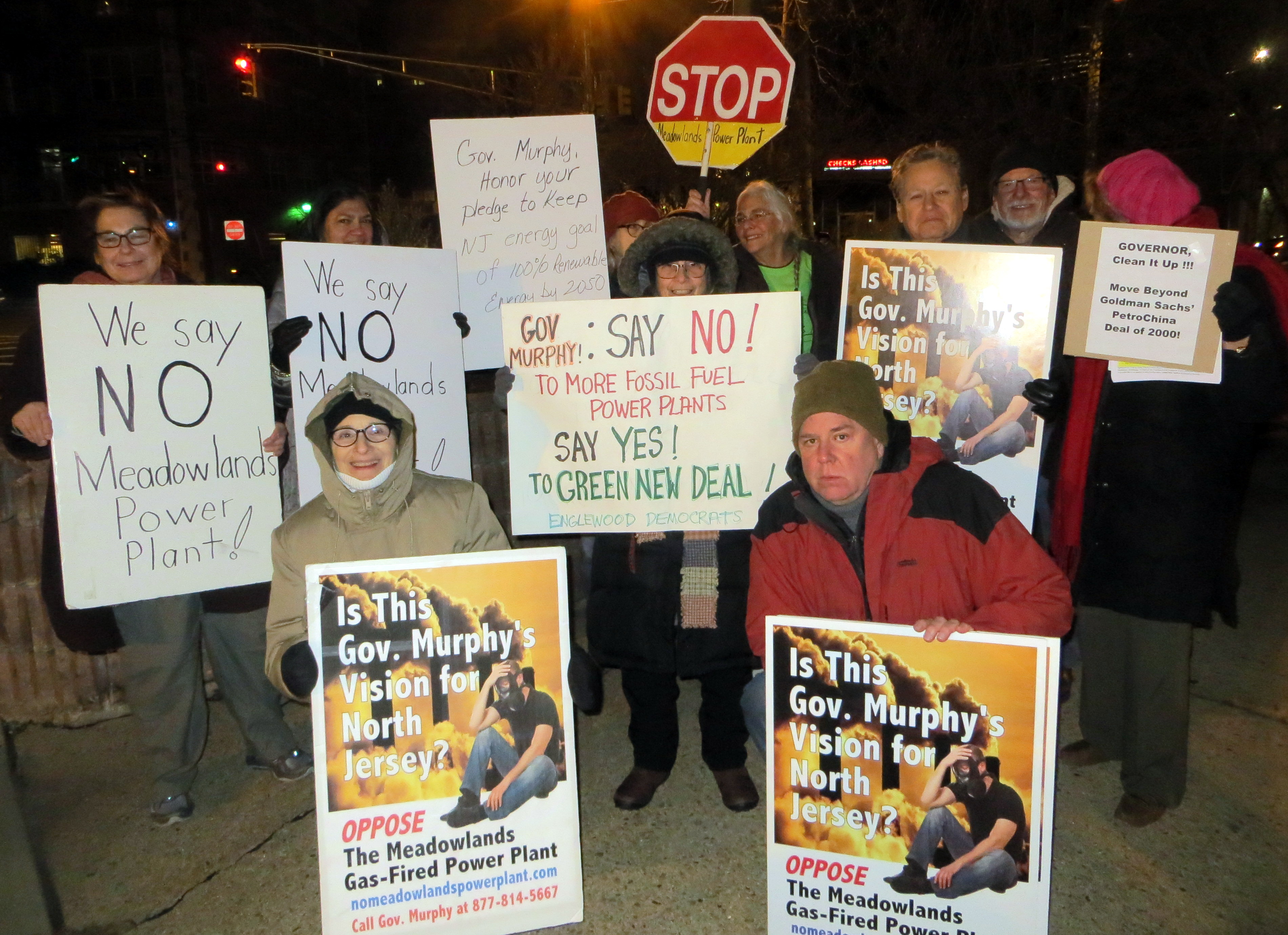 Led by author and activist Paula Rogovin of Teaneck, over a dozen people from various environmental organizations—such as the Sierra Club and Hackensack Riverkeeper, as well as concerned citizens throughout Bergen County—carried posters and stop signs urging Gov. Phil Murphy to reject permits for a proposed 17-acre power plant in the Meadowlands. The activists also want Murphy to issue a moratorium on all fossil fuel infrastructure permits in New Jersey, including pipelines.