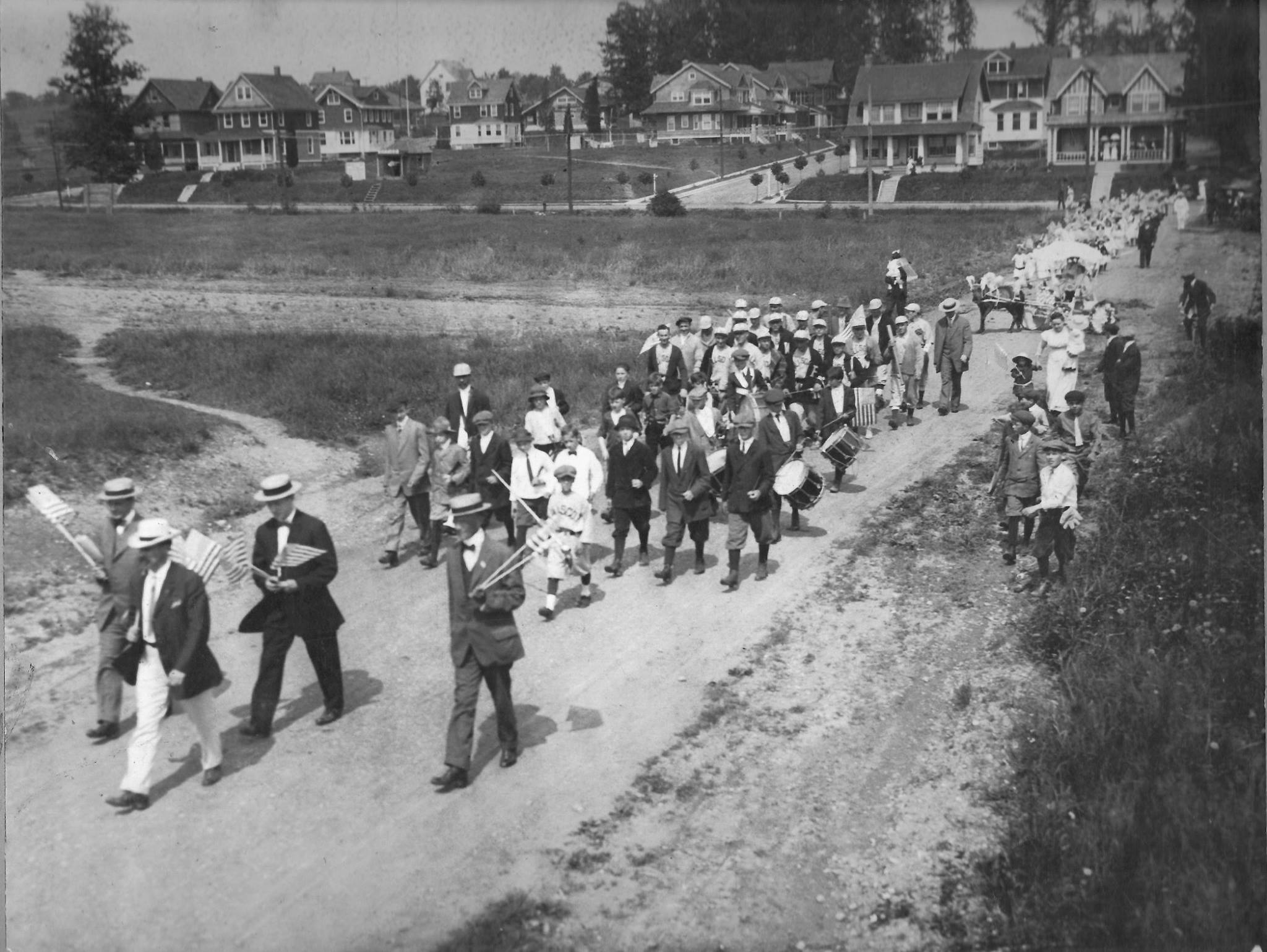 Four men, possibly borough officials, lead the procession. They are followed by a band, a baseball team and then a small horse that is decorated with feathers and pulling a cart. Behind, dozens of little girls file down the street in white dresses. The angle of the photo is probably from a second floor window.