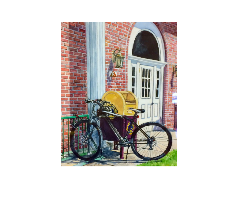 The exhibit features prints from prize-winning watercolor paintings of Times Square, Peggy’s Cove, a Central Park Carriage Horse, Alpine Boat Basin and local Harrington Park scenes, such as the library, downtown, firehouse and parks.