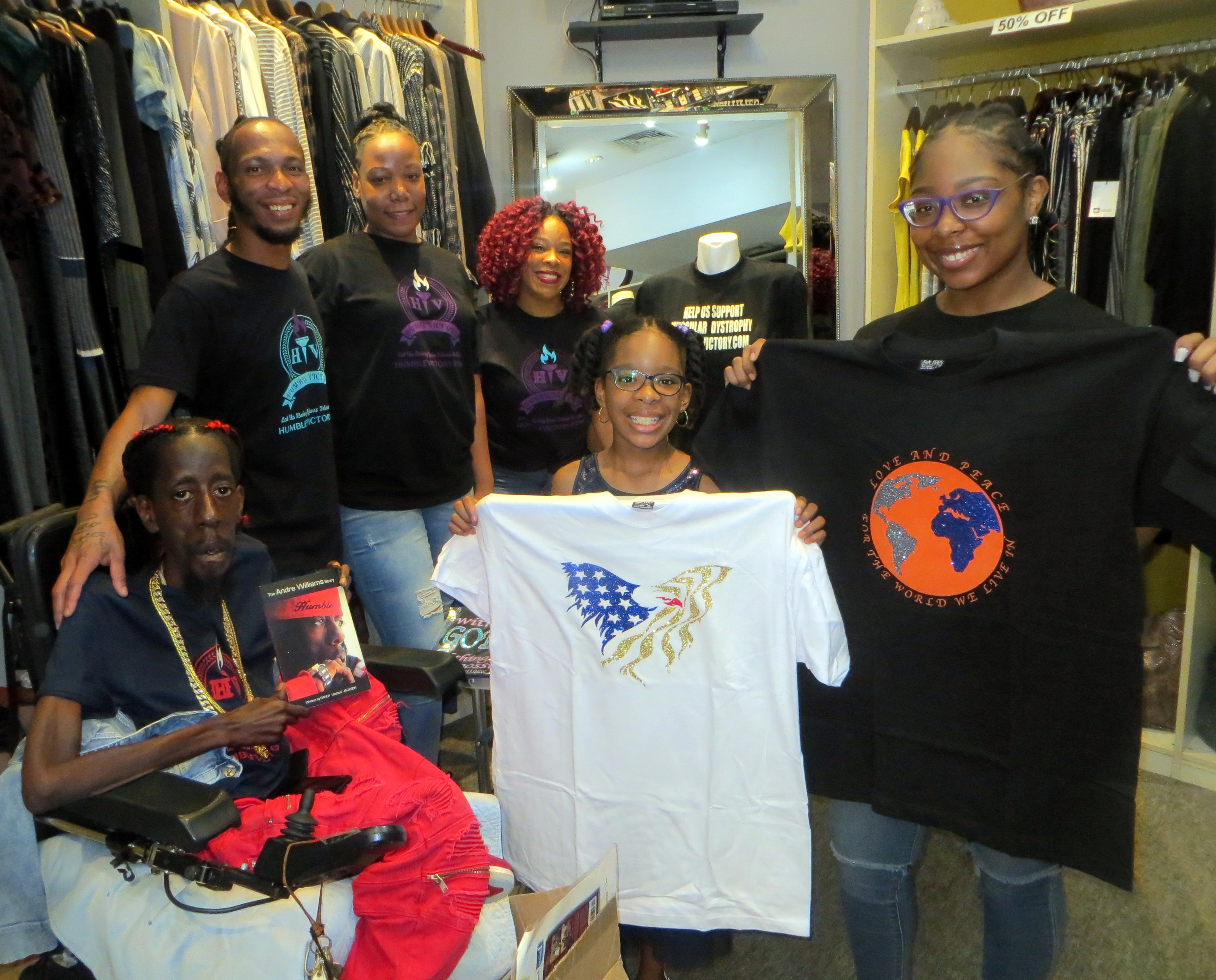 Moss sells his T-shirts on his website, humblevictory.com, and in front of Starbucks in Englewood on weekdays. He and his wife, Luz, also sell his T-shirts at Englewood events such as the Sidewalk Sale and Englewood Community Day.