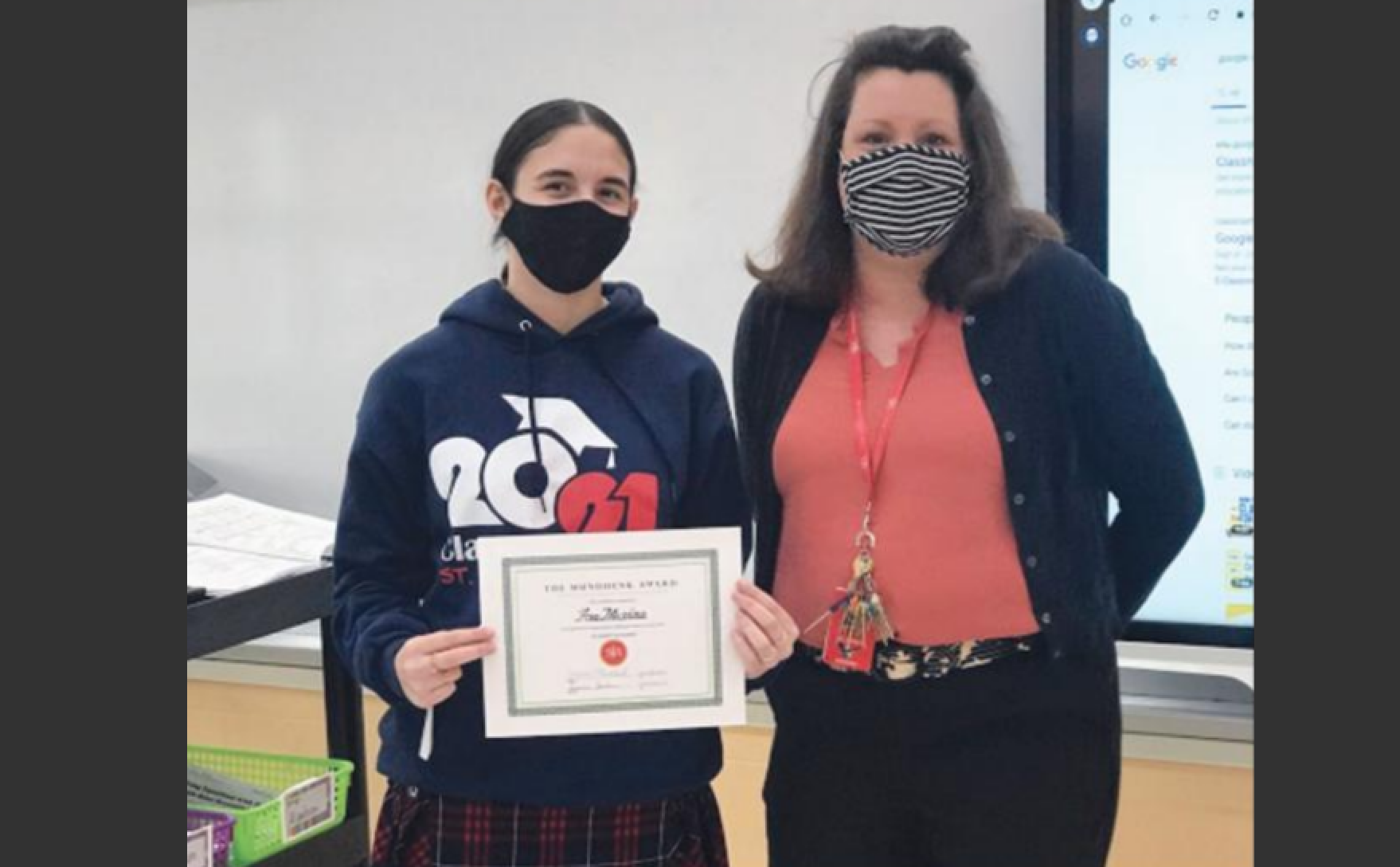 Ava, an eighth-grader, accepted the award with her classmates (participating in the presentation both remotely and in-person), Socha, and Eighth Grade Coordinator Joanna Ariyan.