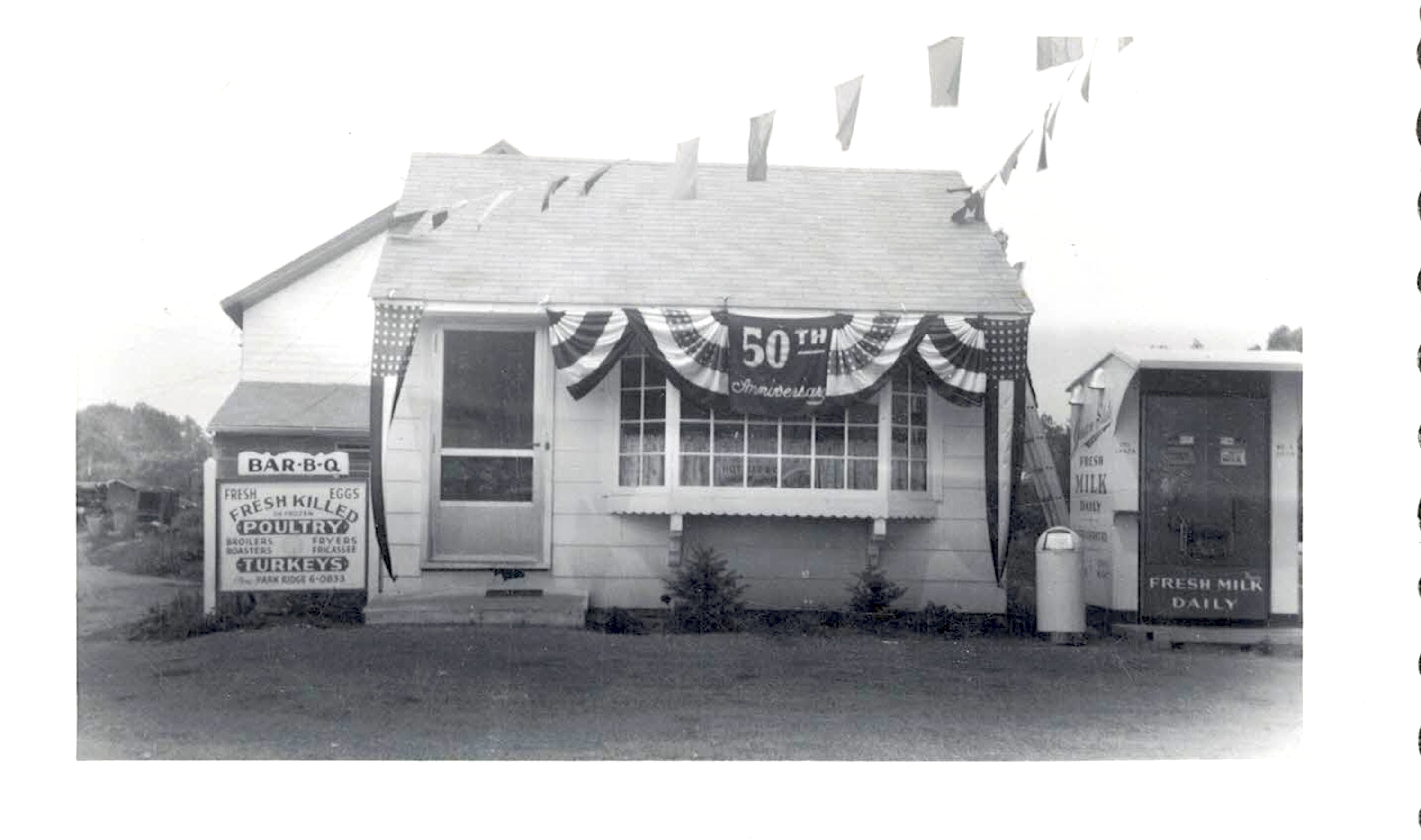 The smaller white building seen between the No Parking sign and the phone booth was a store that sold chicken and turkeys. This business was known as the Stonewell Poultry Farm [pictured at top left].