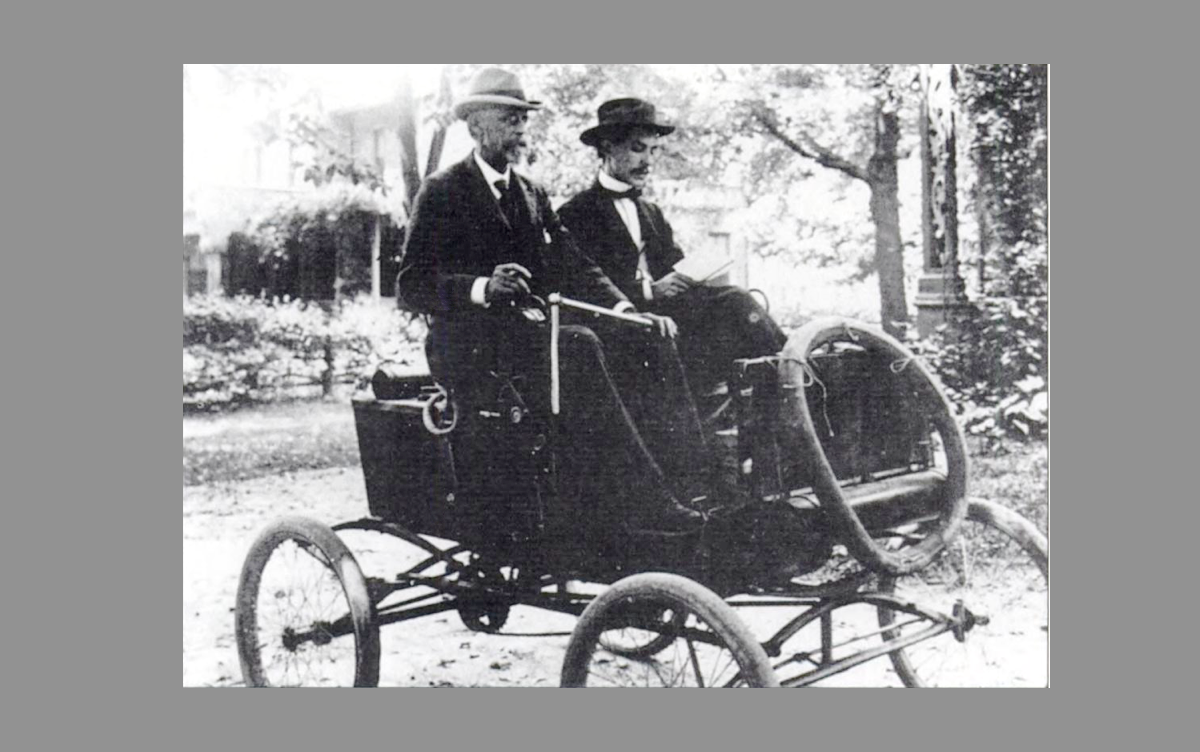 Lyon is the older gentleman in the photo above. The metal bar going across his lap was actually a tiller that was used to steer the car. Tillers were used in the earliest motor cars before steering wheels became the standard.