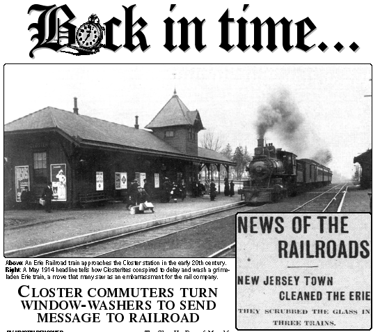 In April of 1914, the Erie Railroad cut the staff assigned to clean its passenger cars. The windows quickly became dusty and grimy. Newspapers along the line decried the new policy, and local boards of health complained to the company. Finally, Closter residents, armed with hoses, cloths and buckets, took matters into their own hands—literally—to give the trains a thorough scrubbing.