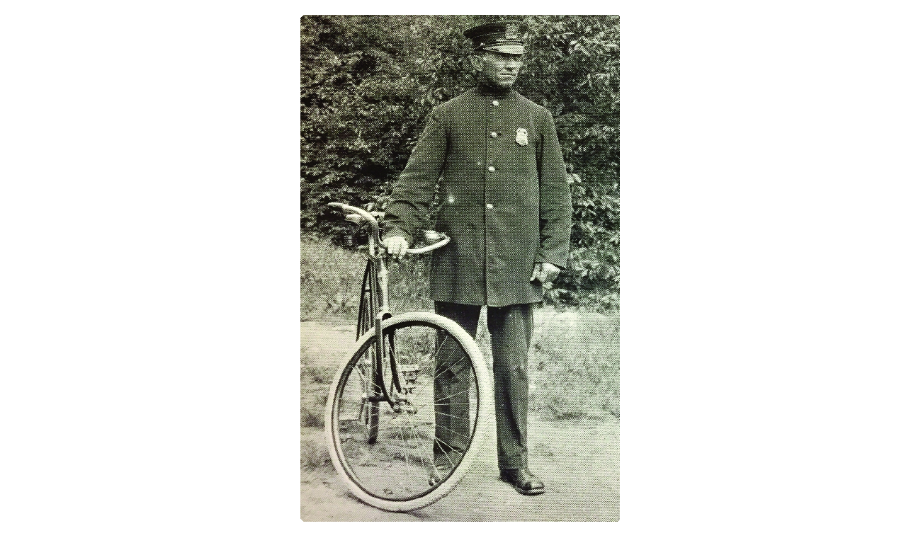 ENGLEWOOD CLIFFS, N.J.—Has anyone ever made a bicycle look more tough? Englewood Cliffs Police Marshal William “Big Bill” Markham is next to his official mode of transportation in this photo dated to the 1910s.