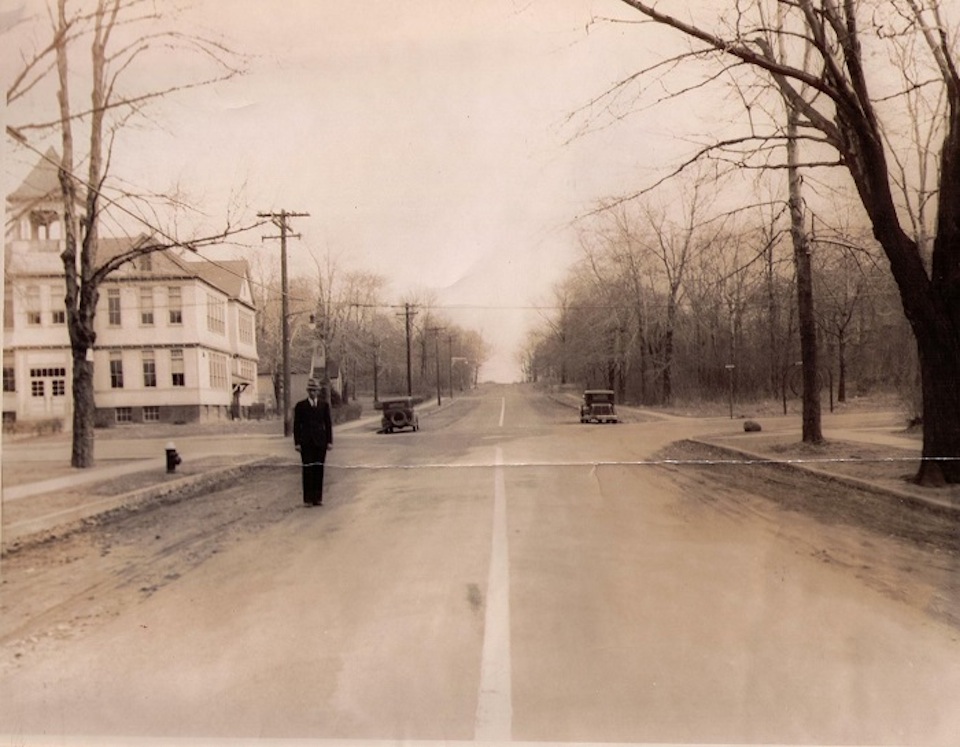 Barely visible beyond the school, directly behind where the man is standing, is the original Holy Trinity Episcopal Church. Built in 1890, the church building was first located on Park Street by the railroad tracks, but was moved to Hillsdale Avenue in 1894. It served for many years until 1966, when it was torn down and the present-day Holy Trinity was constructed in its place.