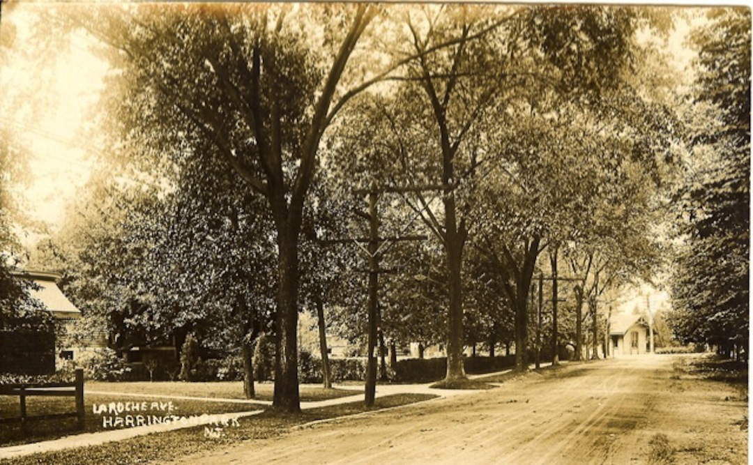HARRINGTON PARK, N.J.—The photographer looks up LaRoche Avenue toward the railroad station in the image above, snapped in Harrington Park in the early 20th century. LaRoche Avenue was still a dirt lane at the time, and tracks from wagons—and maybe even a couple of early autos—are barely visible on the road. About 300 people lived in Harrington Park in those years between 1900 and 1910.