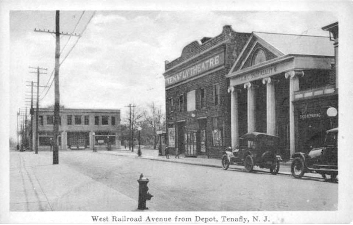 Built circa 1915, the Tenafly Theater on West Railroad Avenue is shown above as it looked in the early 1920s. This photo shows the theater’s original brick front; its present facade was added in 1926.
