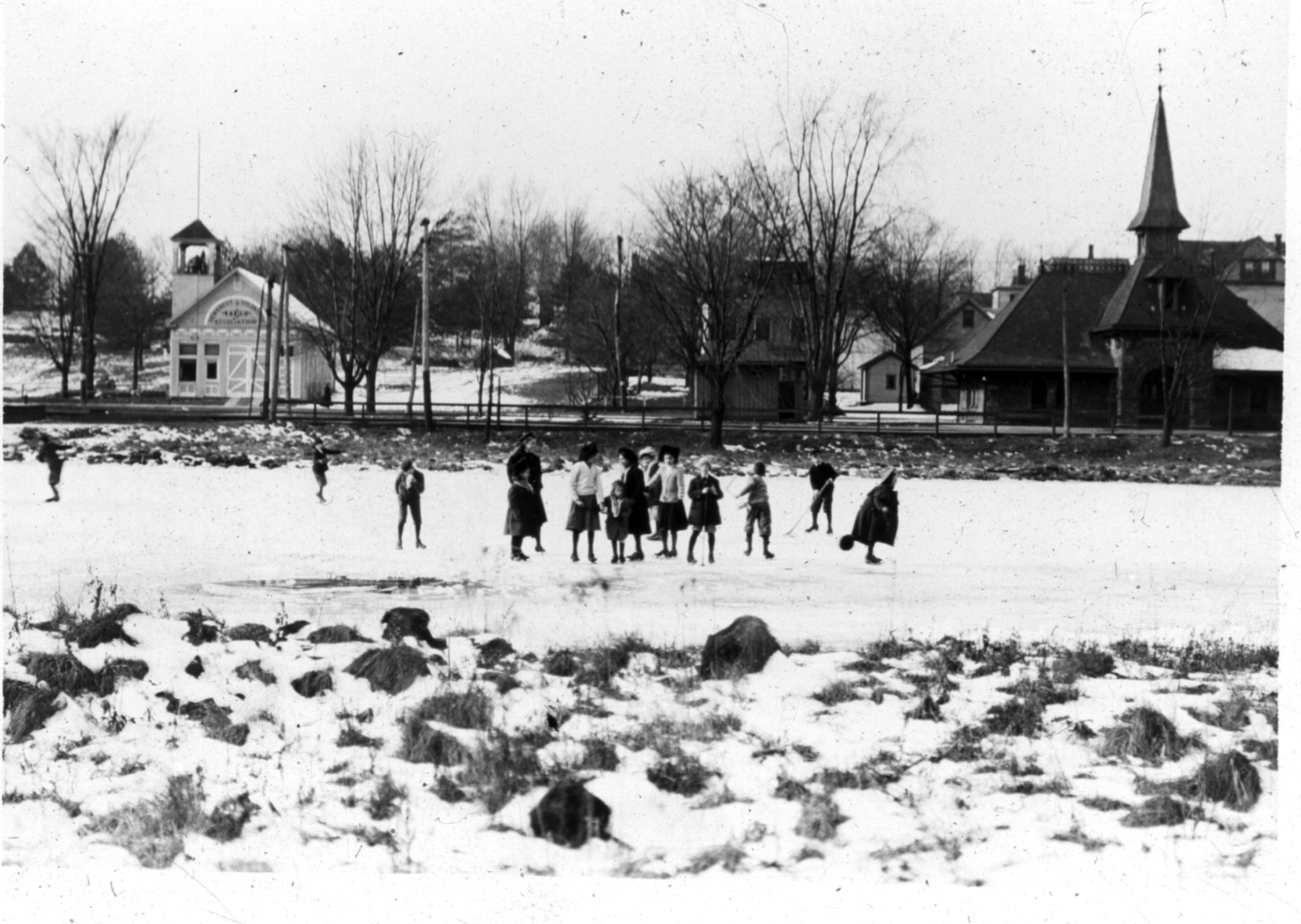 Welcome winter! The season officially began Saturday, Dec. 21. Here’s a look back at a winter past, when some local folks made the best of the frigid weather by ice skating on Demarest Duck Pond. The image dates to around 110 years ago. The boys second and third from right are holding hockey sticks.