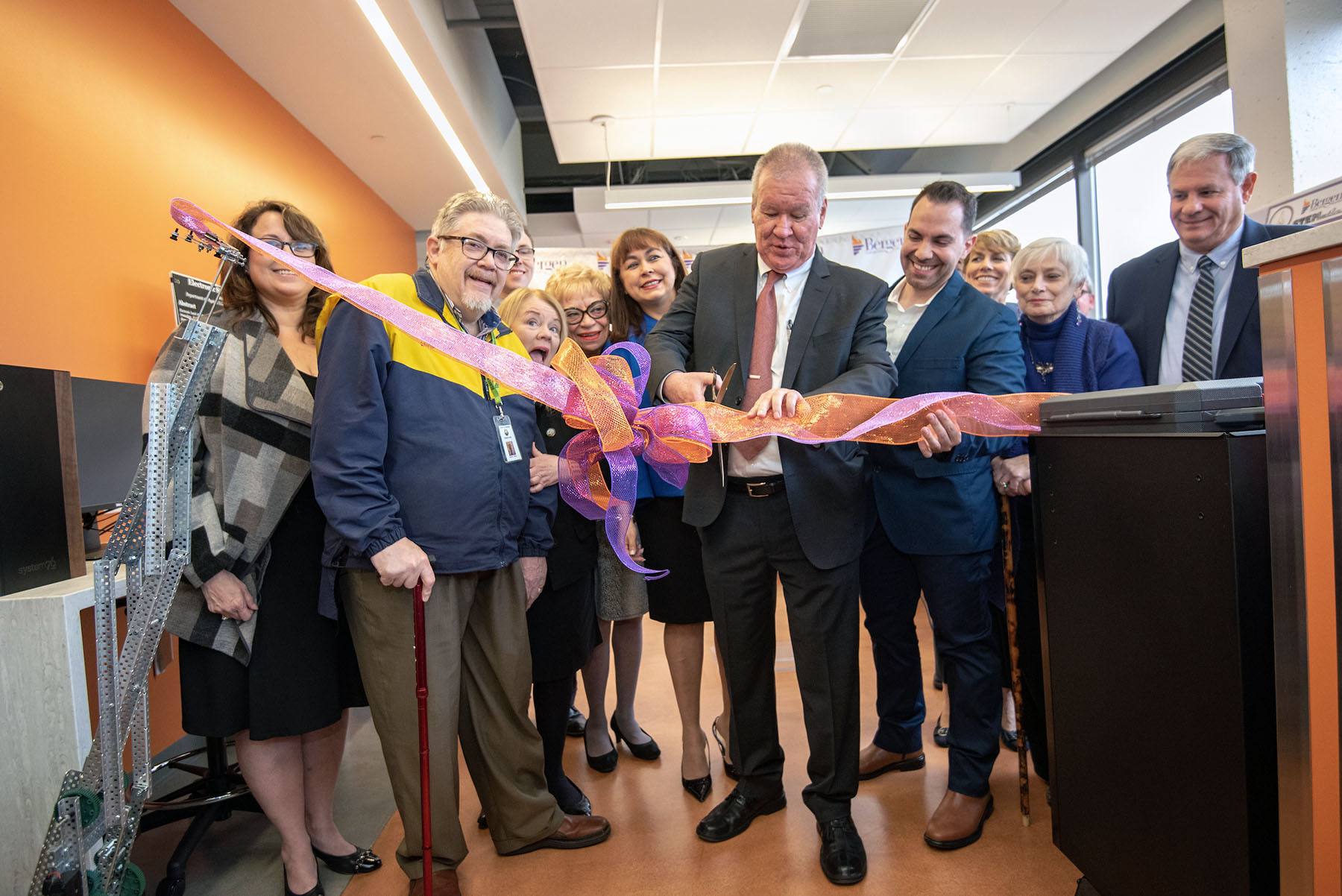 PARAMUS, N.J.—Assisted by a student-constructed robot and joined by Bergen County government officials, faculty, staff and institutional leaders, Bergen Community College President Michael D. Redmond, Ph.D., cut the ribbon on the $1 million STEM Student Research Center April 30 at the College’s main campus. SUEZ sponsored the opening ceremony, donating $5,000 to support the College’s STEM programs.