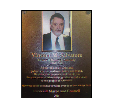 CRESSKILL, N.J.—The Cresskill Mayor and Council dedicated a plaque at borough hall Dec. 4 honoring the late Vincent Salvatore, who served for 18 years as the borough’s attorney.