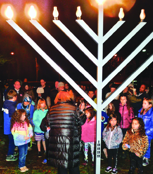 HAWORTH, N.J.—More than 100 exuberant celebrants from Haworth and surrounding towns enjoyed the relatively mild evening on Monday, Dec. 3, the second night of Hanukkah, as the large outdoor menorah was lit up with two electric candles, plus the shamash, which is used to light the other candles.