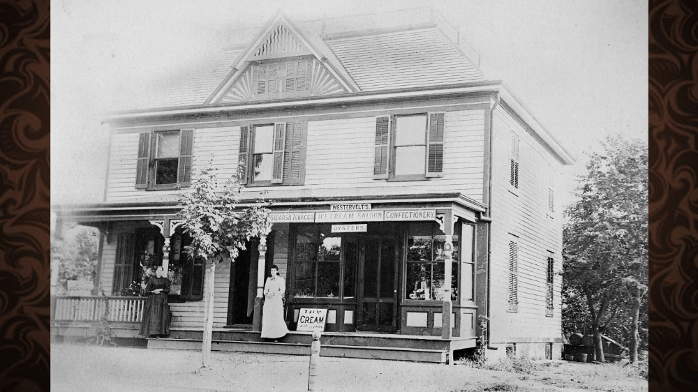 So, what could you do, other than just be miserable? Well, you could open the windows of your home to let in the breeze through cross-ventilation. You could also take a dip in one of the local lakes or brooks. You might have also sought out a cold treat at a place like Westervelt’s Ice Cream Saloon in Westwood, shown here.