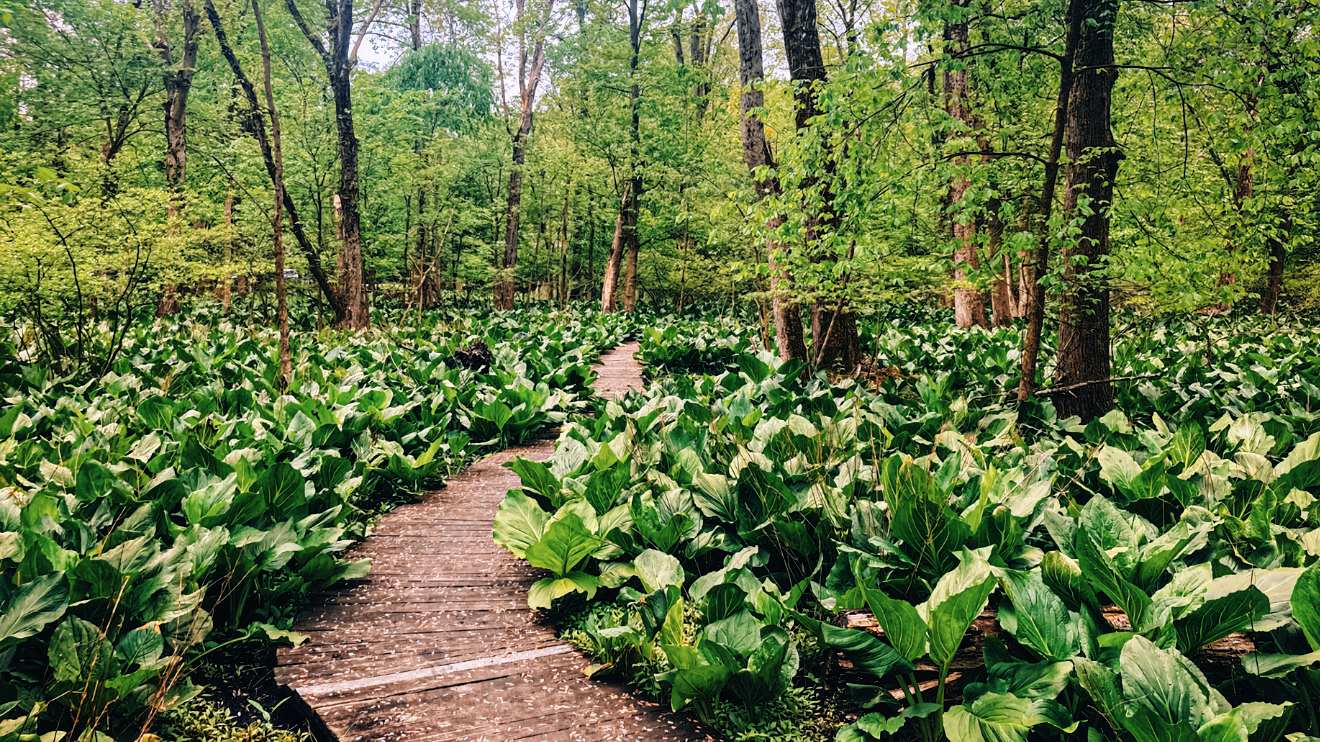 A guide to the area created by the Hillsdale Environmental Commission notes that skunk cabbage, commonly found in wetlands, lines the boardwalk, and that common trees in the upland section of the trail include American beech, Sugar maples, and oak species.