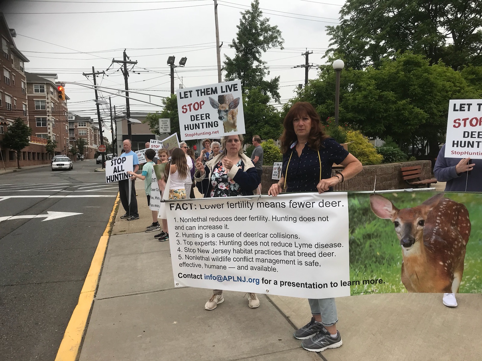 Prior to the 7 p.m. forum’s start, about 40 protesters from Animal Protection League of New Jersey and The League of Humane Voters marched in front of the Municipal Court Room at 73 South Van Brunt Street holding signs such as “Let Them Live / Stop Deer Hunting,” “Stop All Hunting” and “They Feel Pain, They Suffer—Just Like You.”