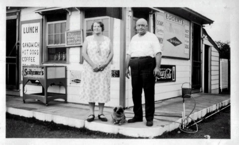 Owners Henry and Louise Eggert, who are pictured above in front of their prefabricated store, ran one of the earliest gas stations and lunch stops in the township. The photo dates to 1931. Notice the little dog, which looks like a pug, between them.