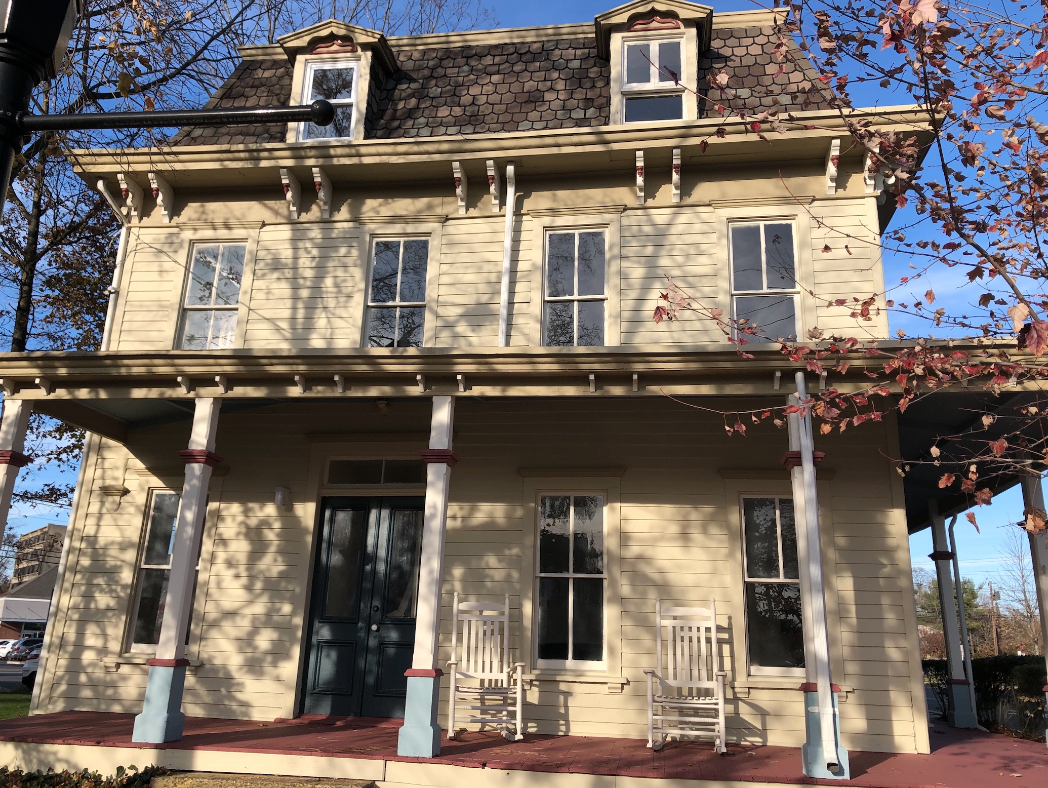 Key defining features include the mansard roof with a concave curve, the double entrance door, near ground-level wraparound porch with chamfered posts on plinths, and paired bracketed cornice under each of the 2.5 stories’ eaves. The clapboard siding was repainted in fall 2019.