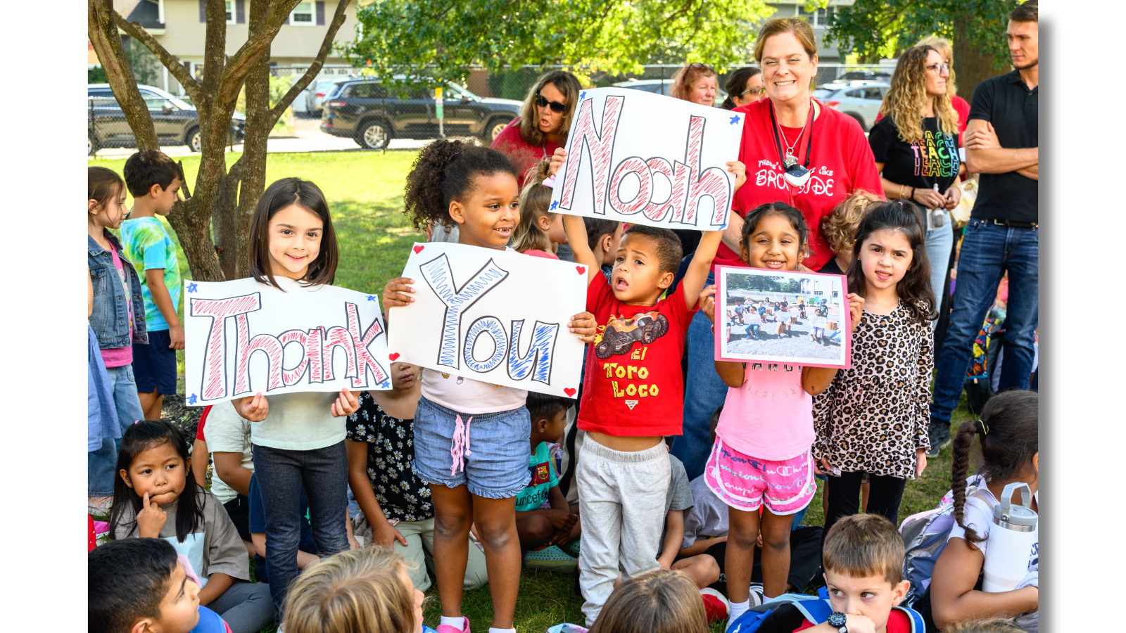 WESTWOOD—The students of Brookside Elementary School on Lake Drive in Westwood spilled onto the lawn Friday afternoon — a happy, controlled chaos — some waving hand-drawn signs that shouted Thank You Noah in block letters, stars, and hearts.