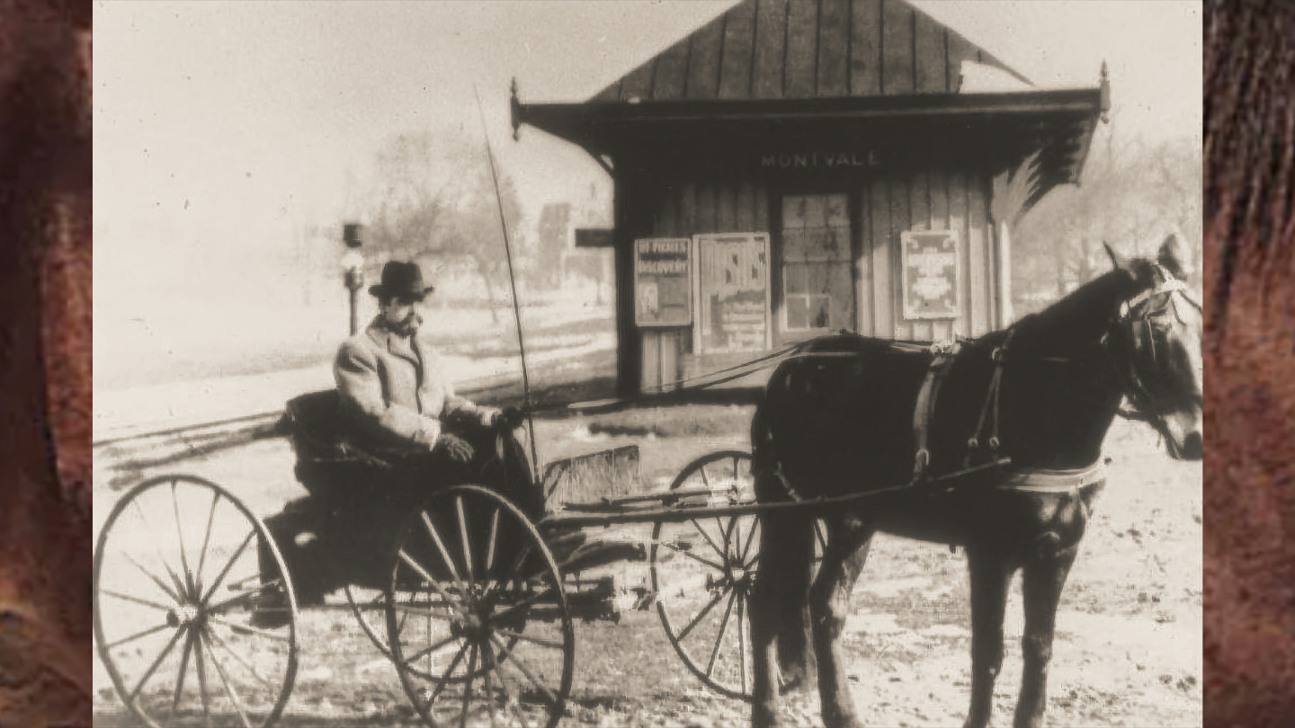 In this image snapped on a winter day in the early 20th century, a man waits in his horse-drawn carriage outside the Montvale train station. It must have recently snowed, as a few spots that had not yet melted are visible on the ground and on the roof of the station in the background.