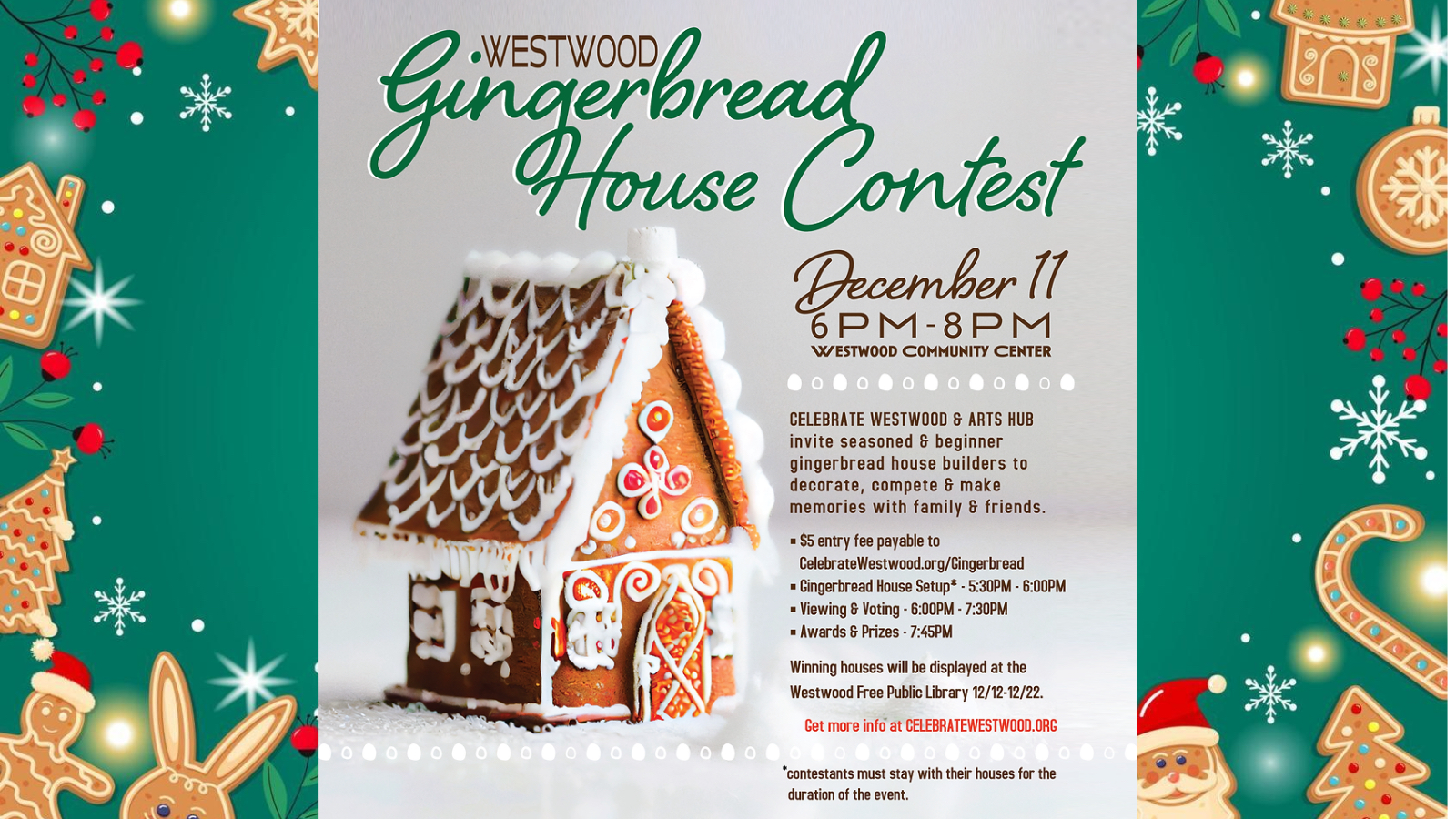 Register at Celebratewestwood.org/Gingerbread ($5 registration fee). Participants are invited to set up their display at the Westwood Community Center (55 Jefferson Ave.) on Dec. 11 from 5:30 to 6 p.m. and stay with their displays throughout the duration of the event. Gingerbread houses should be made off-site in advance, with only mild tweaks necessary for display the night of the event.