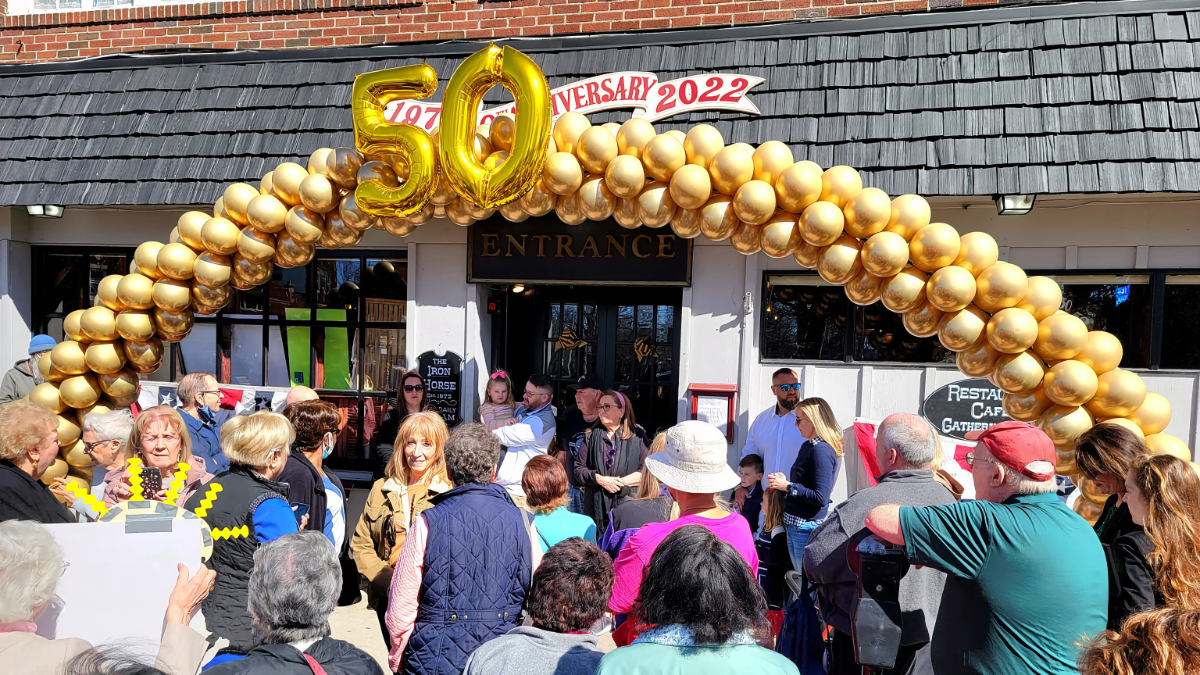 They kept the bar but expanded the dining room and also gave the restaurant a new name—the Iron Horse. On opening night, a line formed outside the door. The place was a hit—and, in an amazing feat in a notoriously difficult industry, the Iron Horse remains a local favorite after more than 50 years.The scene March 21, 2022: Coffee and a fantastic birthday cake were served from 11 a.m. to noon, and the restaurant and bar — closed Mondays as a concession to staffing shortages stemming from the pandemic — opened its kitchen and bar at 4 p.m., delighting throngs of 50th-anniversary revelers.