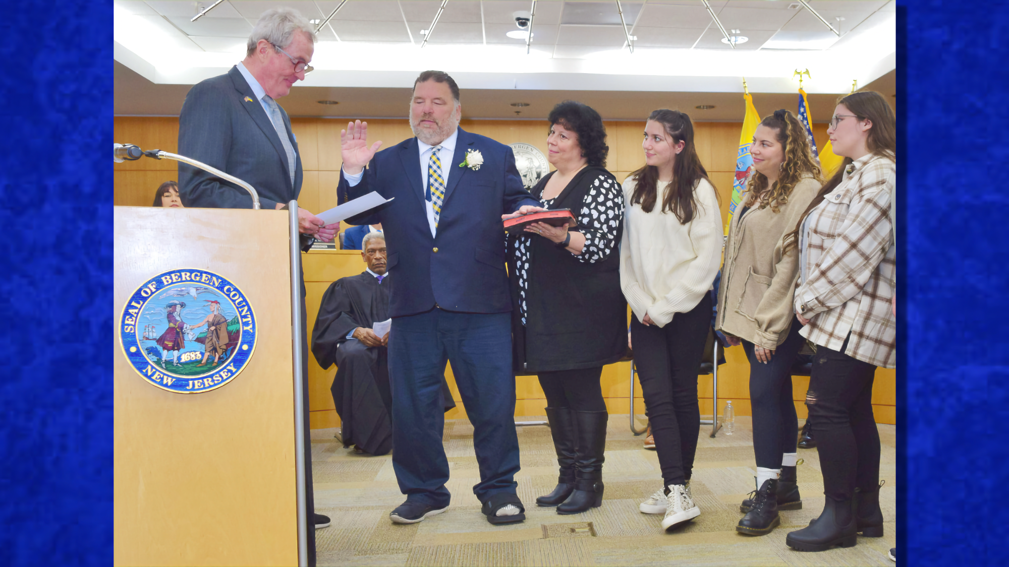 After Bergen County Clerk John Hogan announced the November vote tallies, Gov. Phil Murphy swore in commissioners Mary J. Amoroso (D–Mahwah), Ortiz (D–Emerson), and Sullivan (D–Montvale) to their third full terms in office. Murphy was joined in the ceremony by Bergen County Executive James Tedesco III, U.S. District Court Judge Julien X. Neals, and Sen. Paul Sarlo.