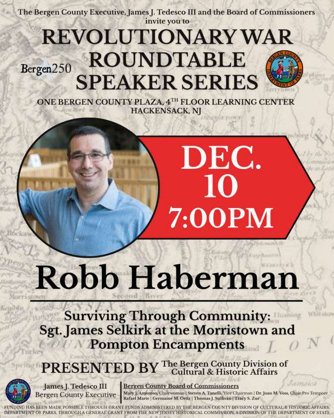 HACKENSACK — The Bergen250 initiative continues its fall series of Revolutionary War Roundtable presentations with a lecture on Wednesday, Dec. 10, at 7 p.m. Historian Robb Haberman will present “Surviving Through Community: Sgt. James Selkirk at the Morristown and Pompton Encampments.”