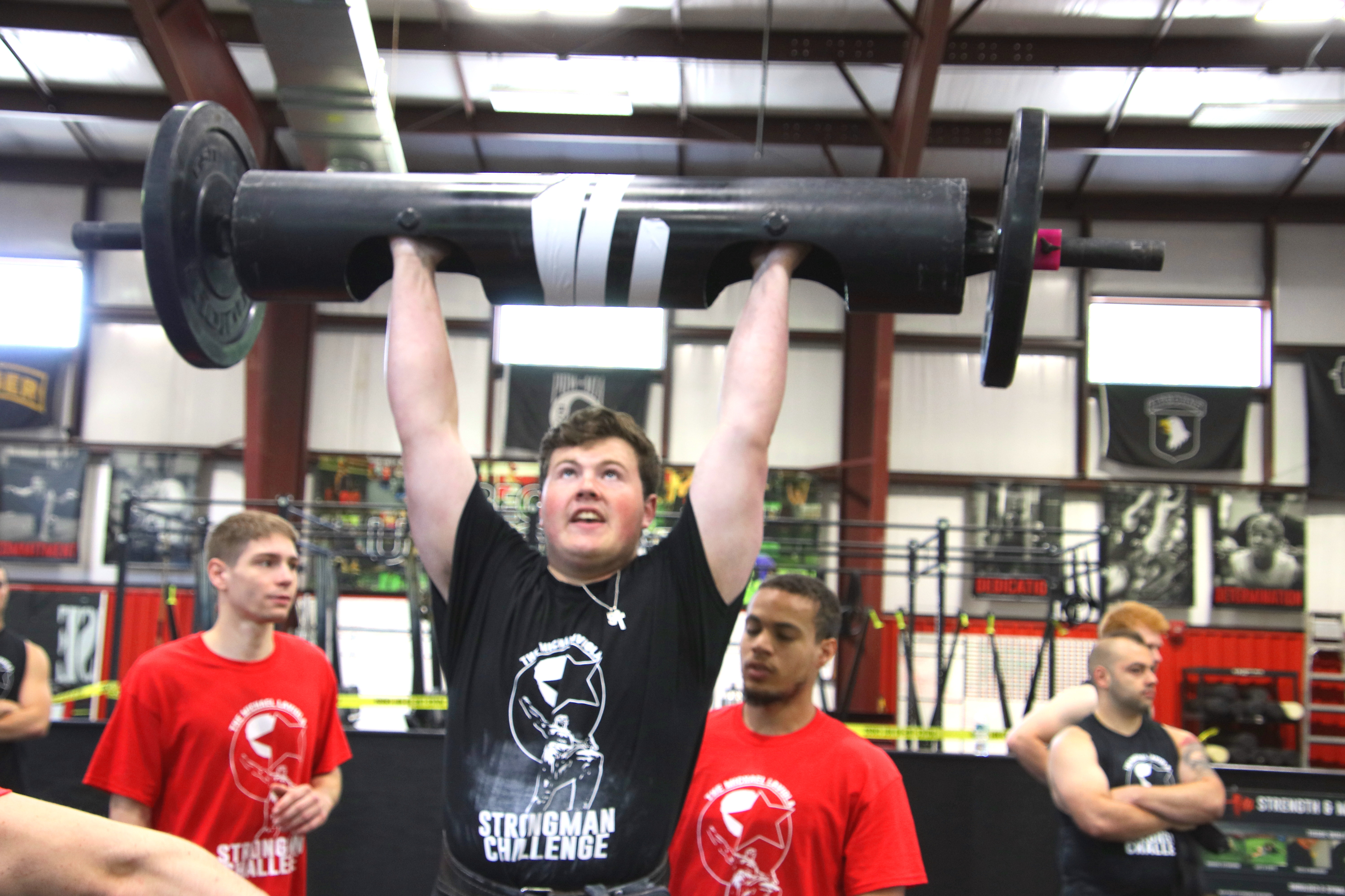 Participants of the Strongman Challenge are split into three groups: junior varsity (eighth and ninth graders), high school, and college/adult. The three events were an overhead log press, a sled pull and push, and a max-distance sandbag carry.