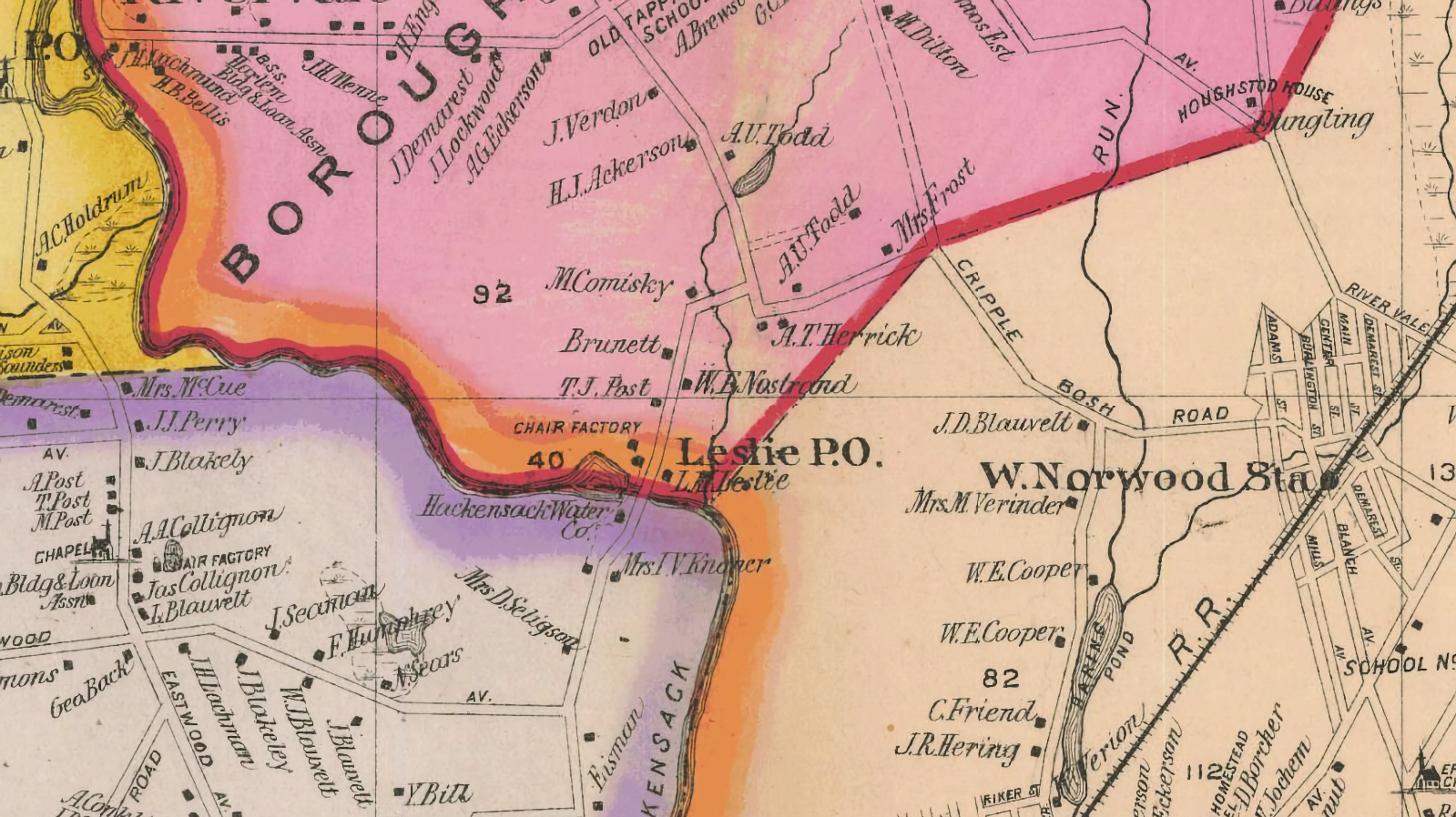Leslie owned considerable land in what would become Old Tappan and River Vale. Today’s Cooper’s Lane and a portion of Westwood Avenue north of it were once known as Leslie Road. Where Westwood Avenue crosses the river was Leslie’s Bridge.