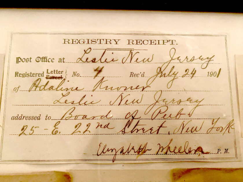 From 1900 to 1903, he operated the Leslie Post Office from his property. The Pascack Historical Society museum holds a receipt for a registered letter sent July 24, 1901, from Adaline Knoner through the Leslie, New Jersey, post office. The receipt is signed by postmaster Elizabeth Wheeler, who held the position from 1900 to 1902. Elizabeth and her husband boarded at the Leslie residence.