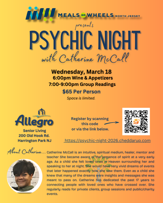 WOODCLIFF LAKE — Meals on Wheels North Jersey will host a Psychic Night fundraiser featuring intuitive and spiritual medium Catherine McCall on Wednesday, March 18, beginning at 6 p.m. at Allegro Senior Living, 200 Old Hook Road, Harrington Park.