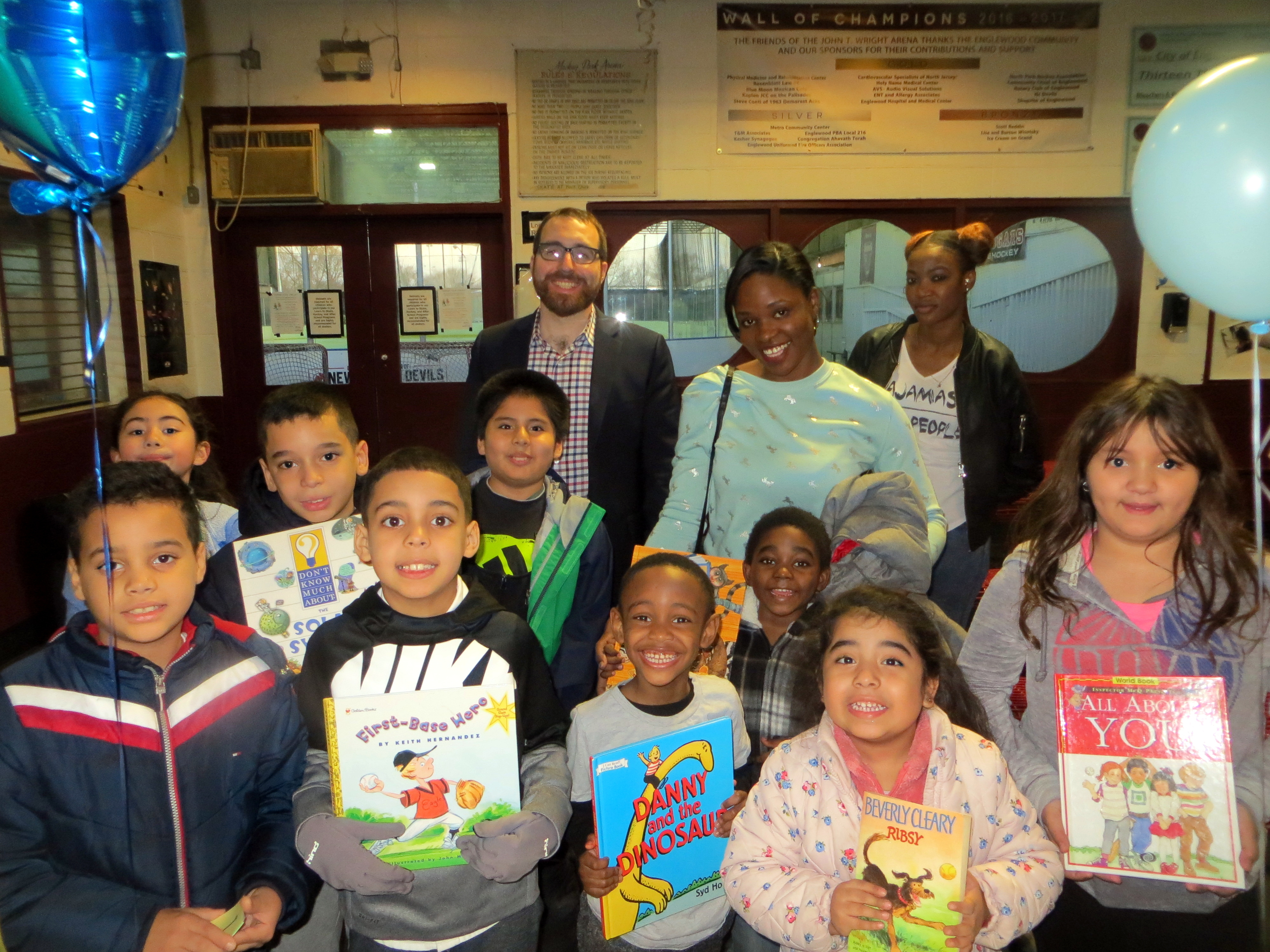 Before donning their skates, families approached a table with boxes of books where they were greeted by Englewood Library Director John Arthur, Helm and Jonathan Nacht. Each child was invited to choose a free book from the large assortment that had been brought over from the library. There were books appropriate for all age groups, with topics such as baseball, dinosaurs, adorable pets and the solar system.