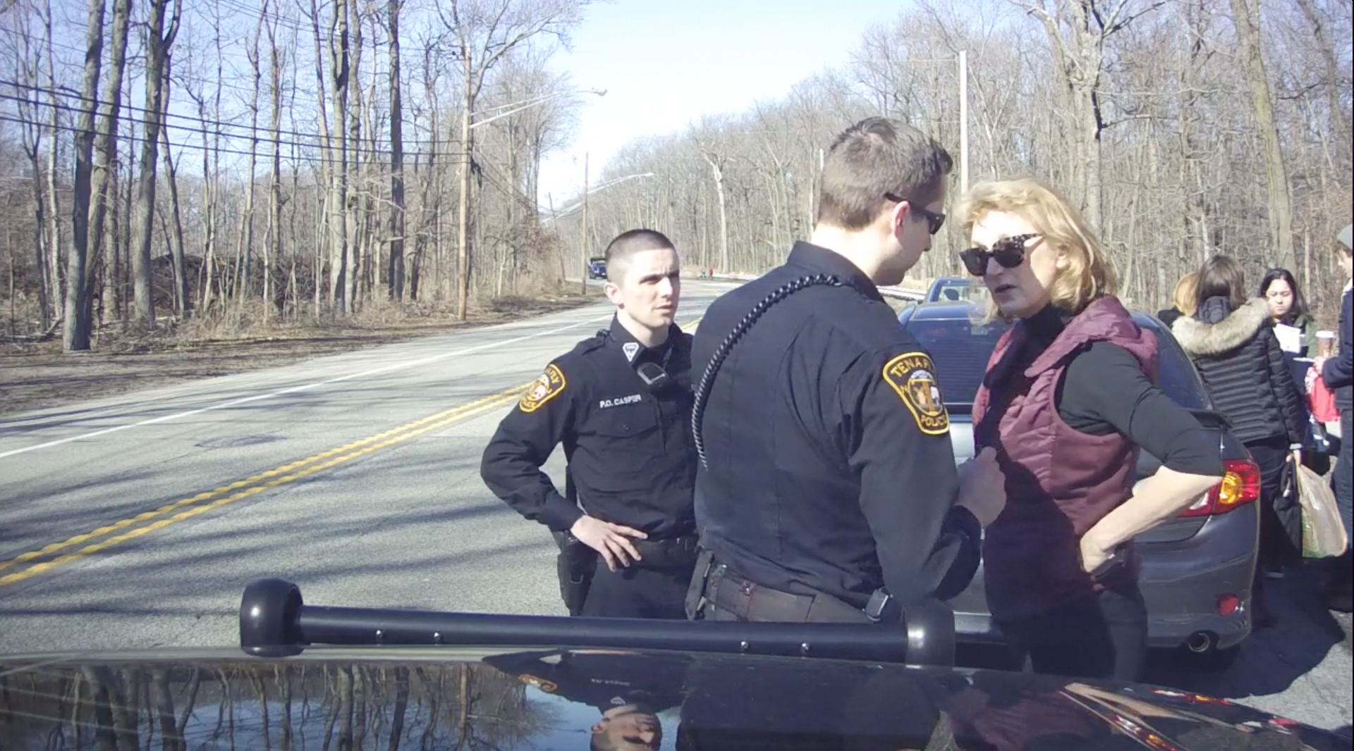 The two Tenafly police officers, Matthew Savitsky and Tom Casper, were waiting for the car to be towed from 9W to an impound lot when Caren Turner showed up. In his report, Savitsky wrote shortly after her arrival “she then began a line of questioning in a demanding nature. She demanded to be informed what is going on and why they [vehicle occupants] were stopped.”