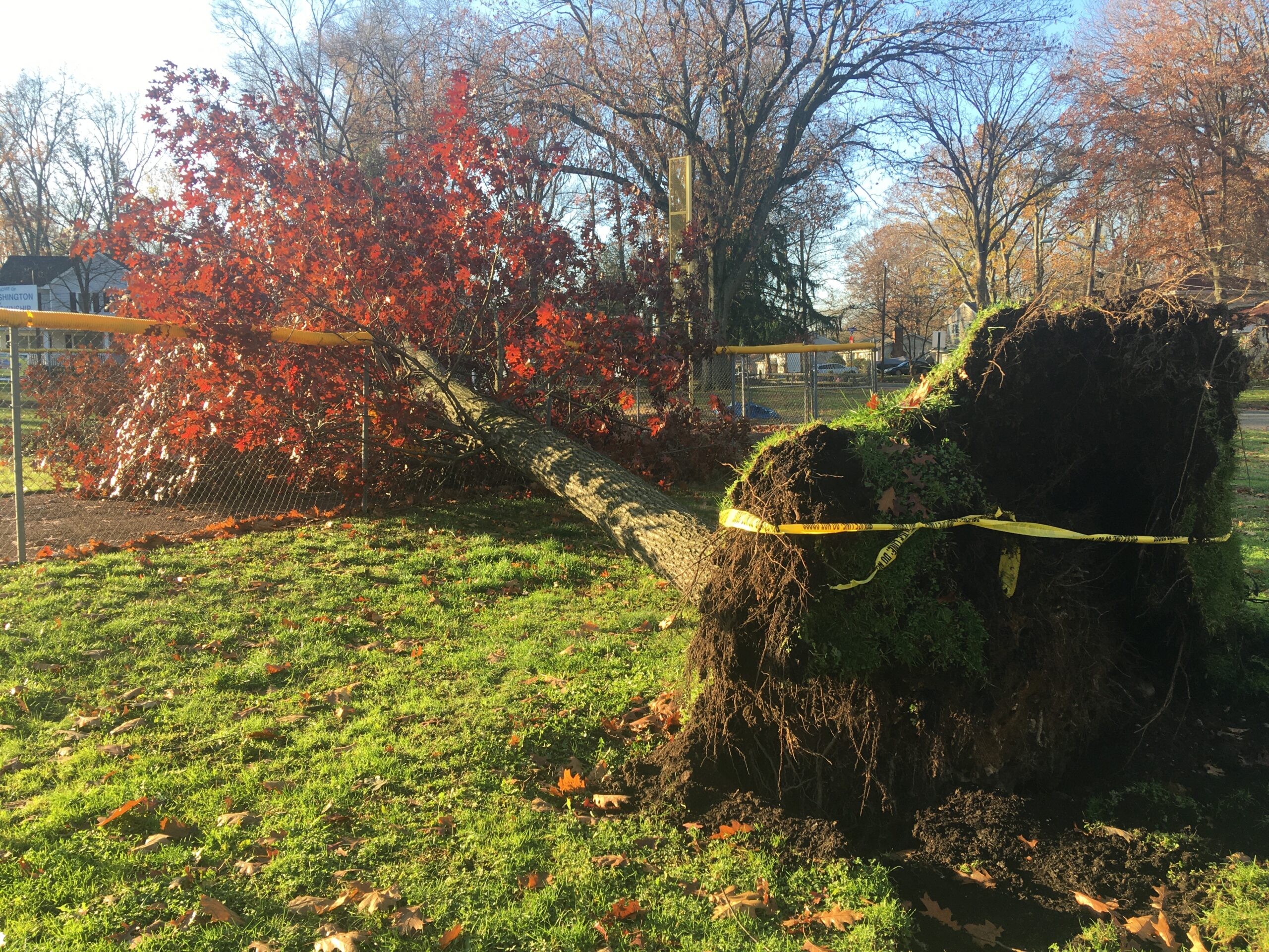 TOWNSHIP OF WASHINGTON, N.J.—A mature red oak at Clark Field was no match for the strong wind gusts that swept over North Jersey on Sunday night, uprooting and crashing down through the chain link fence at Cleveland Avenue.