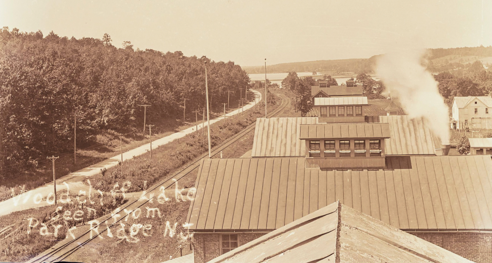 PARK RIDGE, N.J.—The Woodcliff Reservoir was a recent addition to the landscape when our featured photograph was captured 120 years ago this week: June 10, 1905. The rooftops in the foreground belonged to the Mittag & Volger factory in Park Ridge. Broadway, which is on the left parallel to the railroad tracks, was a small dirt lane.