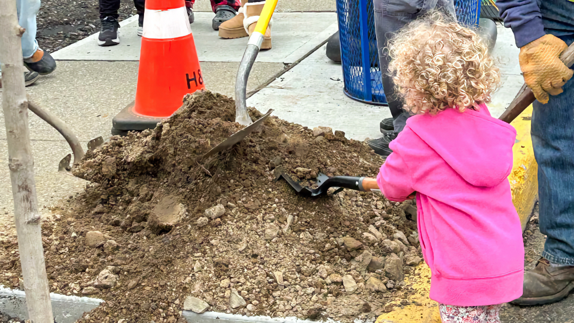 Department of Public Works (DPW) liaison Michael Murtaugh demonstrated how to score the roots to avoid girdling and promote healthy growth. The DPW had pre-dug the holes and delivered fresh wood chips. The trees were planted in brand-new sidewalk tree pits, installed as part of recent improvements to the lot.