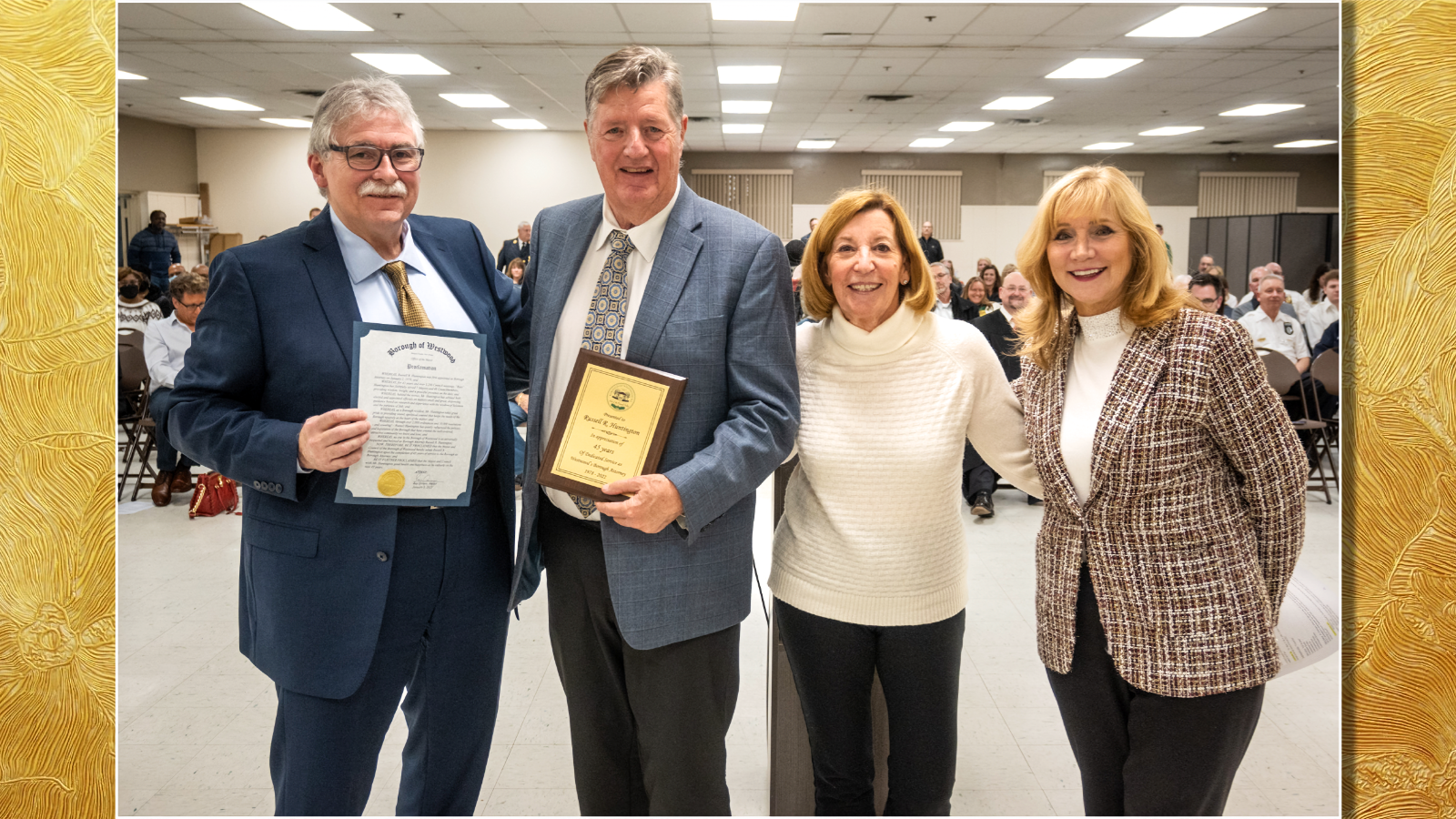 The proclamation reads in part, “Russell Huntington has quietly influenced the policies and legislation of the borough that have created the well-ordered, attractive community we know and love; and no one in the Borough of Westwood is as universally respected and beloved as Borough Attorney Russell R. Huntington.”