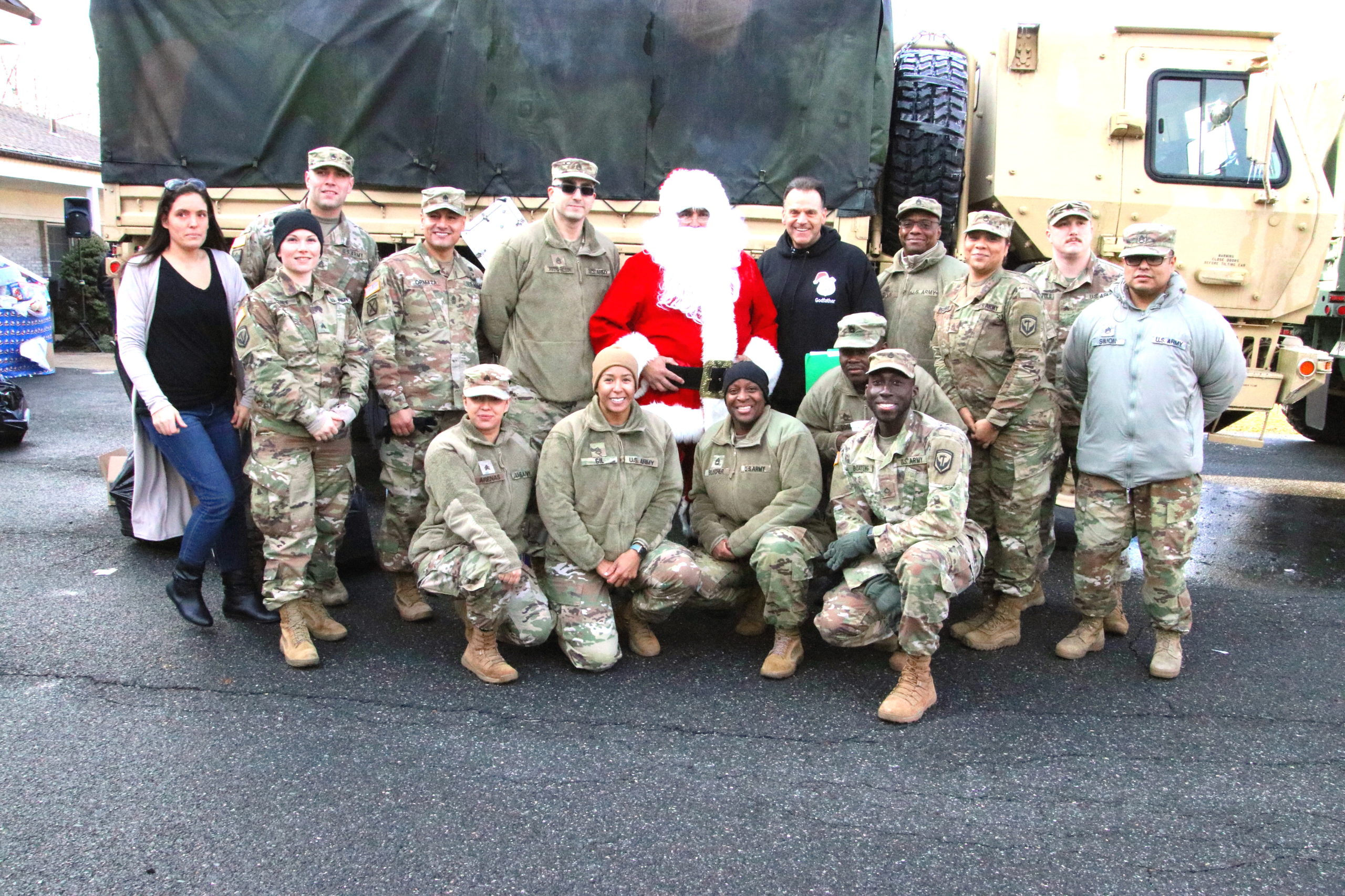 U.S. Army troops from the Teaneck Armory put some precision into a local toy collecting operation organized by the men and women of Bergen County’s police benevolent associations, with support and generosity from local donors, on Dec. 18 at the Closter Hook and Ladder Co. The troops are joined by Santa and toy drive founder, retired Closter police Sgt. Donald Nicoletti. | Photo by Murray Bass