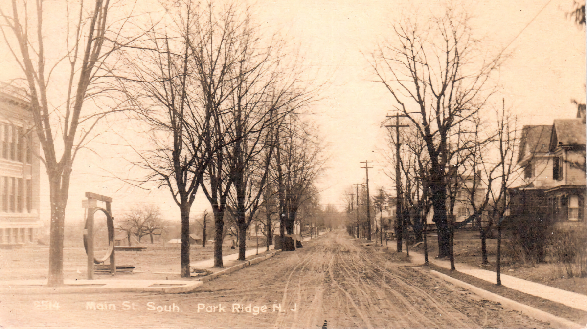 PARK RIDGE—The photograph at top was snapped on Pascack Road (or Main Street as it was called then) in Park Ridge on a winter’s day more than a century ago. The unpaved road is covered by the thin tracks left behind by wagon wheels and early automobile tires.