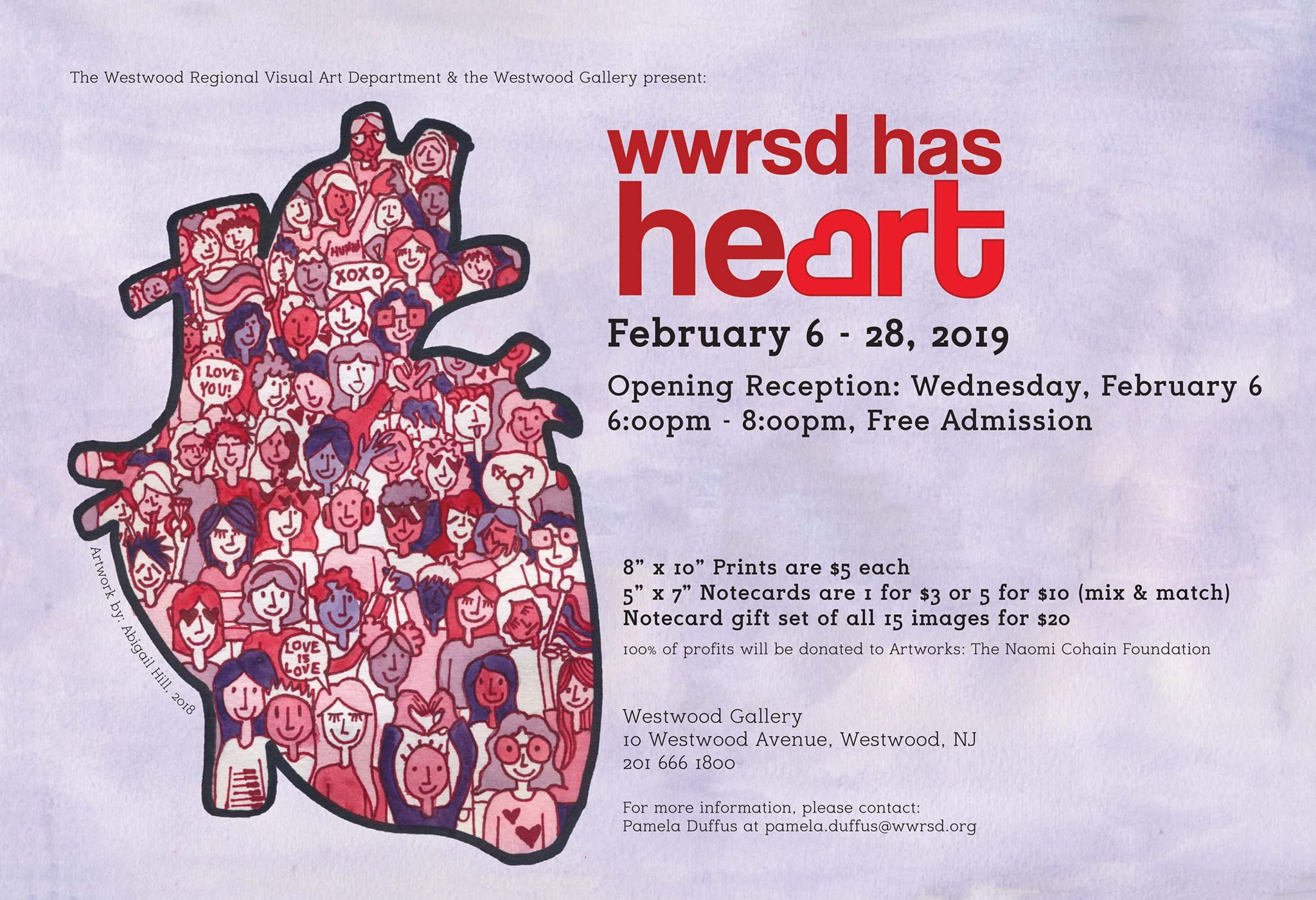 - 8-in. x 10-in. prints by all the artists in the show can be purchased for $5 at Westwood Gallery or from Pamela Duffus atpamela.duffus@wwrsd.org.
