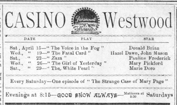 “At the Westwood Casino—a Big Special Show every Wednesday and Saturday evening,” reads a 1913 advertisement from the Westwood Chronicle. “High class Vaudeville, illustrated songs, and five reels of pictures every Saturday evening. Admission 10 cents and 15 cents.”