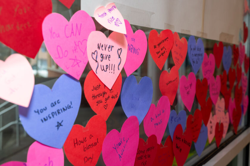 Students also wrote positive messages on paper hearts that were displayed in school windows, an activity organized with help from the guidance department to reinforce community support and well-being. The school described the project overall as In the middle of it all, the heart matters.