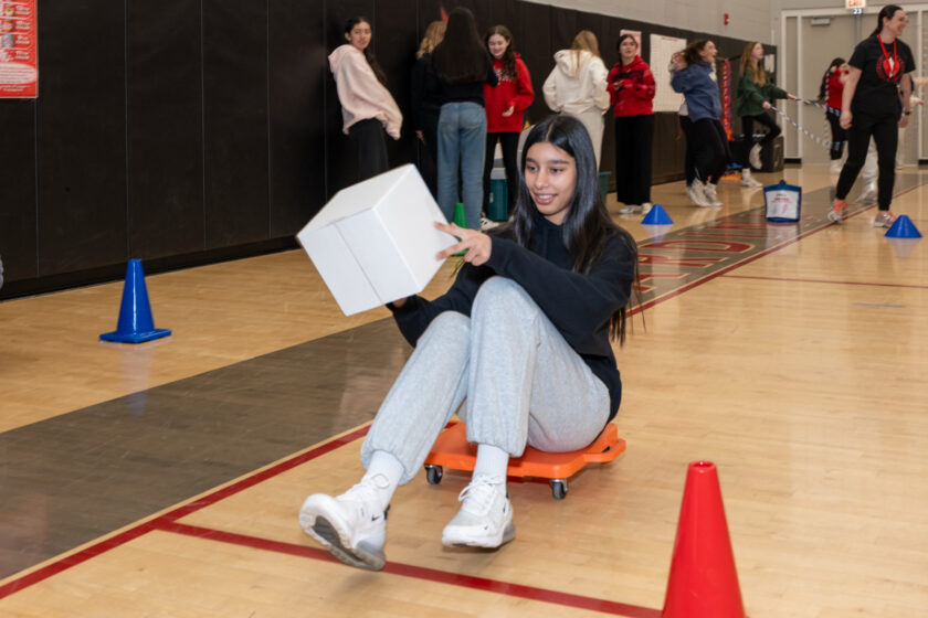 At one station focused on nutrition, students used scooters to race and stack sugar cubes representing “added sugars,” paired with posters showing sugar equivalents in popular drinks.