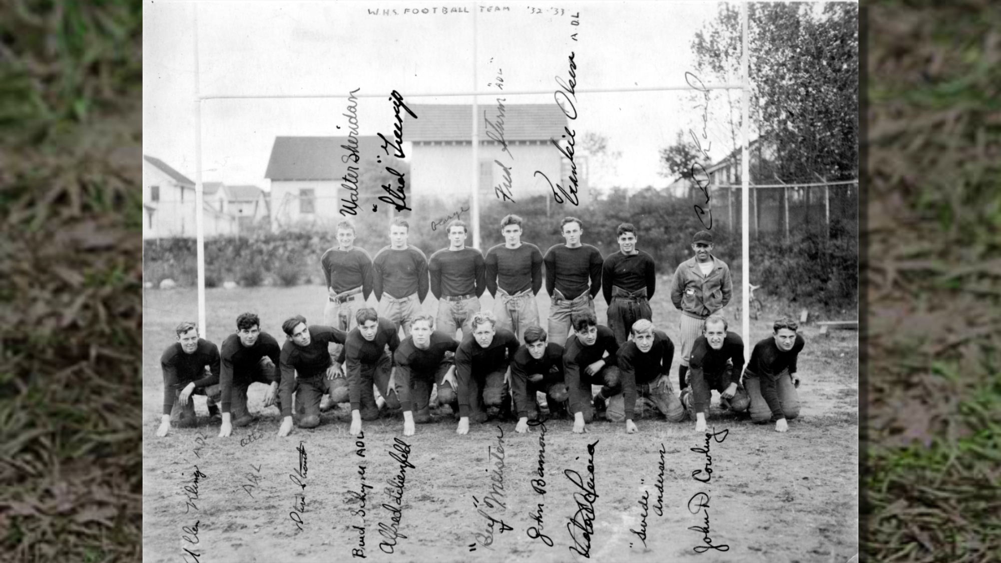 Meisten and Greenip were among seven 1931 lettermen who returned for the 1932 season. Others included Fred Sturm, Frank Olsen, Alfred Lillienfeld, Stephen Straub, and Ralph “Suede” Anderson. The boys were coached by Charles Lucid, pictured at far right in the top row. Lucid was in his second year as athletic director of the high school. He lived in Westwood with his wife and two sons. The family had just taken a big trip over the summer, motoring across America to see the 1932 Summer Olympics held in Los Angeles.