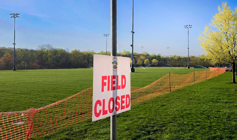 The field remains closed through the end of May while newly laid sod germinates. Despite orange fencing and signs clearly stating “FIELD CLOSED,” multiple incidents have been reported of people—primarily children—climbing over the barrier and using the field.