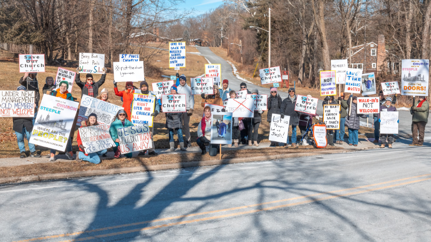 At least 20–30 parishioners protested every Sunday in February outside the church grounds on Woodland Avenue near Grand Avenue, a busy thoroughfare. Some hold signs reading, “Under New Management, Old Members Not Welcome,” “Bring Back St. Paul’s Nursery School,” “Jesus Wouldn’t Turn Us Away,” and “We Want Our Church Back.”