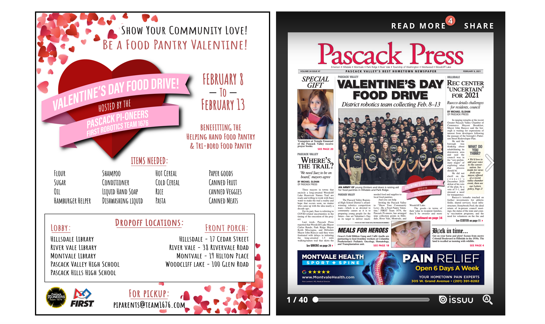 Inviting the Pascack Valley to “Show Your Community Love—Be a Food Pantry Valentine,” FIRST Team 1676, the Pascack Pi-oneers, has arranged nine collection points in Hillsdale, River Vale, Montvale, and Woodcliff Lake.